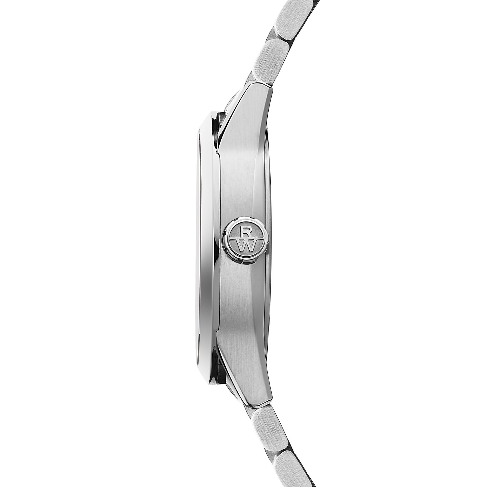 The stainless steel bracelet, fitted with a double-push folding clasp, ensures both comfort and security. A screwed-down crown embossed with the RW monogram and a transparent sapphire caseback reveal the automatic movement within, showcasing the W-shaped oscillating weight, a distinctive signature of the brand. Water-resistant up to 100 meters, this timepiece reflects both performance and elegance.