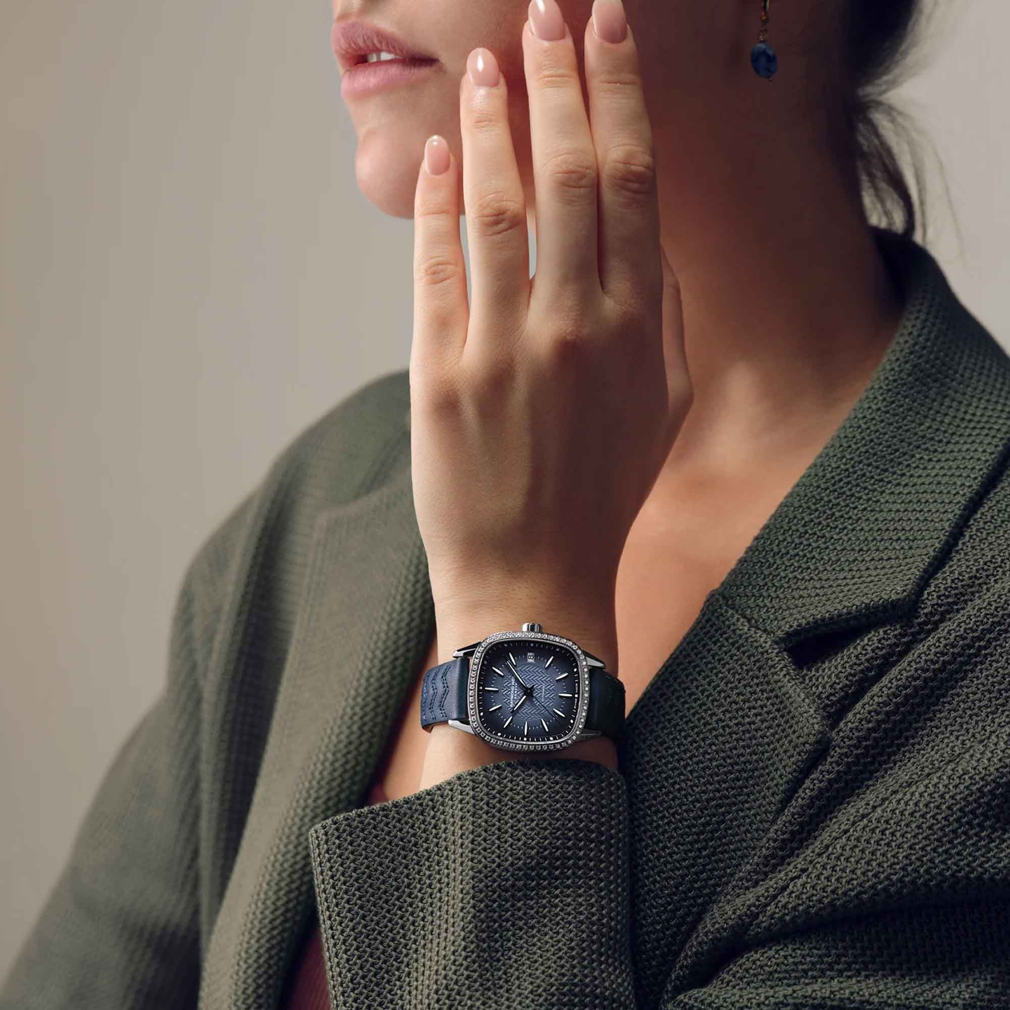 Measuring a 34.5 x 34.5 mm diameter, the freelancer ladies automatic has a square, cushion-shaped housing and features an automatic Swiss-made movement, with a 38 hours power reserve, ideally suited to daily wear.