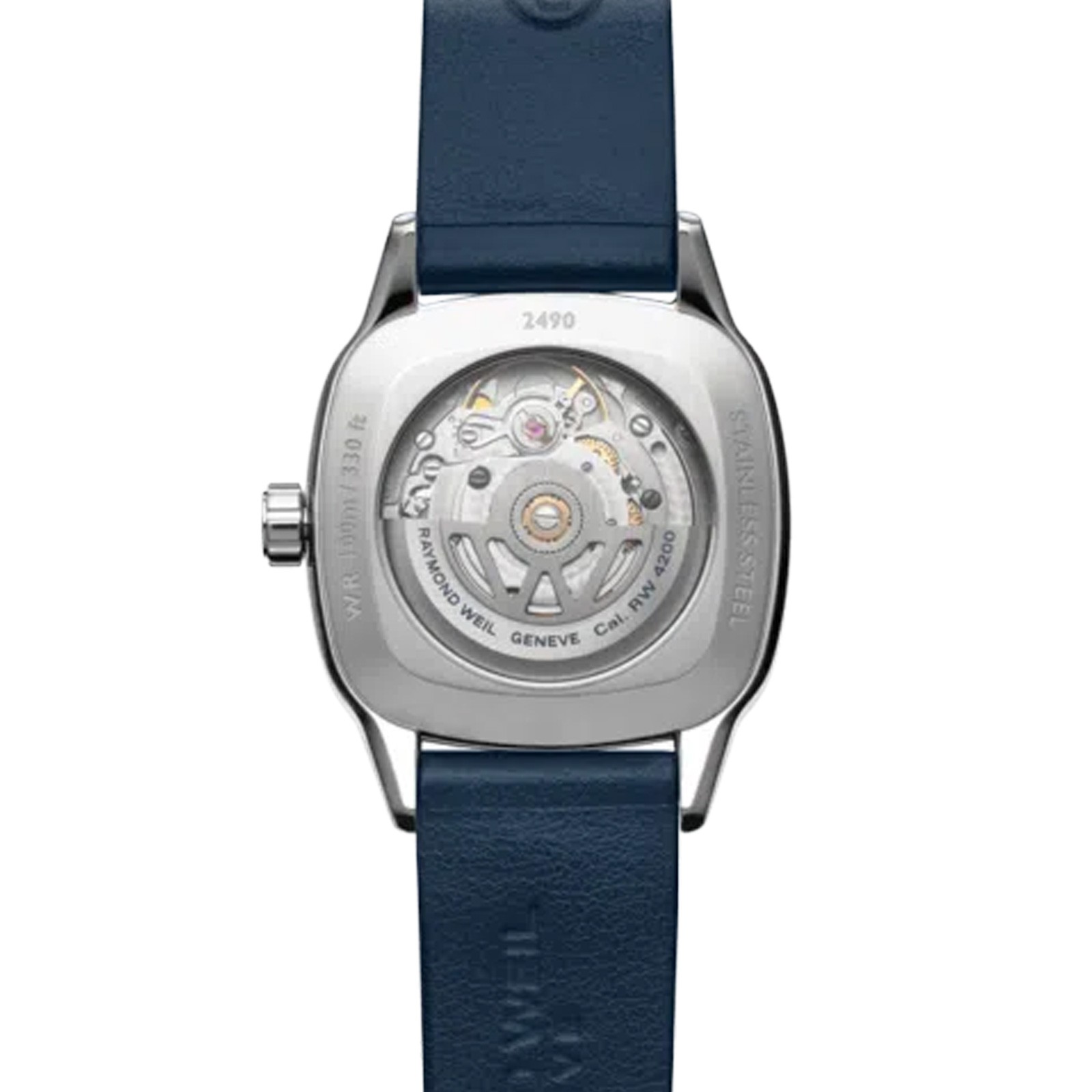 The dial’s gradient blue draws the eye towards the center, where a captivating W-shaped motif, as a nod to the RAYMOND WEIL brand, creates subtle shades that mesmerize the wearer.