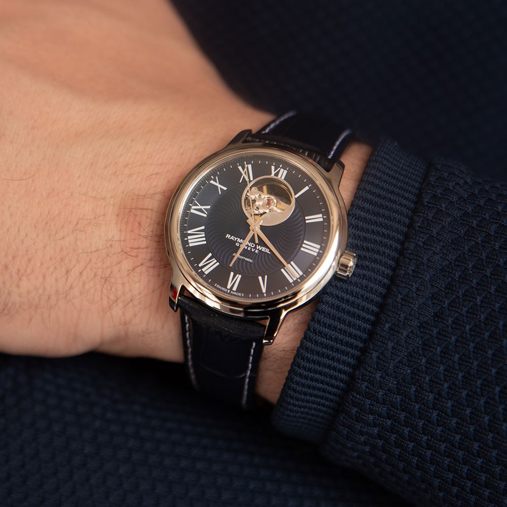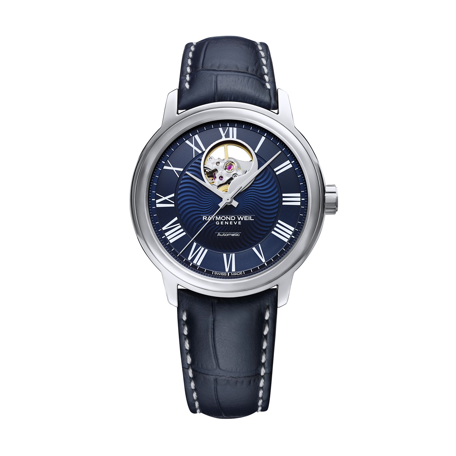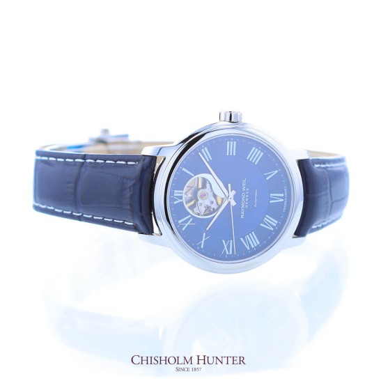 Raymond Weil Genève is a Swiss luxury watchmaker, founded in 1976 in Geneva. It is a family company founded by Raymond Weil and Simone Bédat.The company was carried along by Weil’s passion for creating traditional Swiss watches with a difference, dared to claim his independence and establish his own vision of Swiss watchmaking: high quality, innovative, elegant and accessible.Raymond Weil Maestro timepiece is presented on a blue leather strap. The 40mm stainless steel case encases a blue dial with silver Roman numeral hour markers. This watch is powered by an automatic RW4200 movement with 38 hour power reserve. Water resistant to 50 metres.