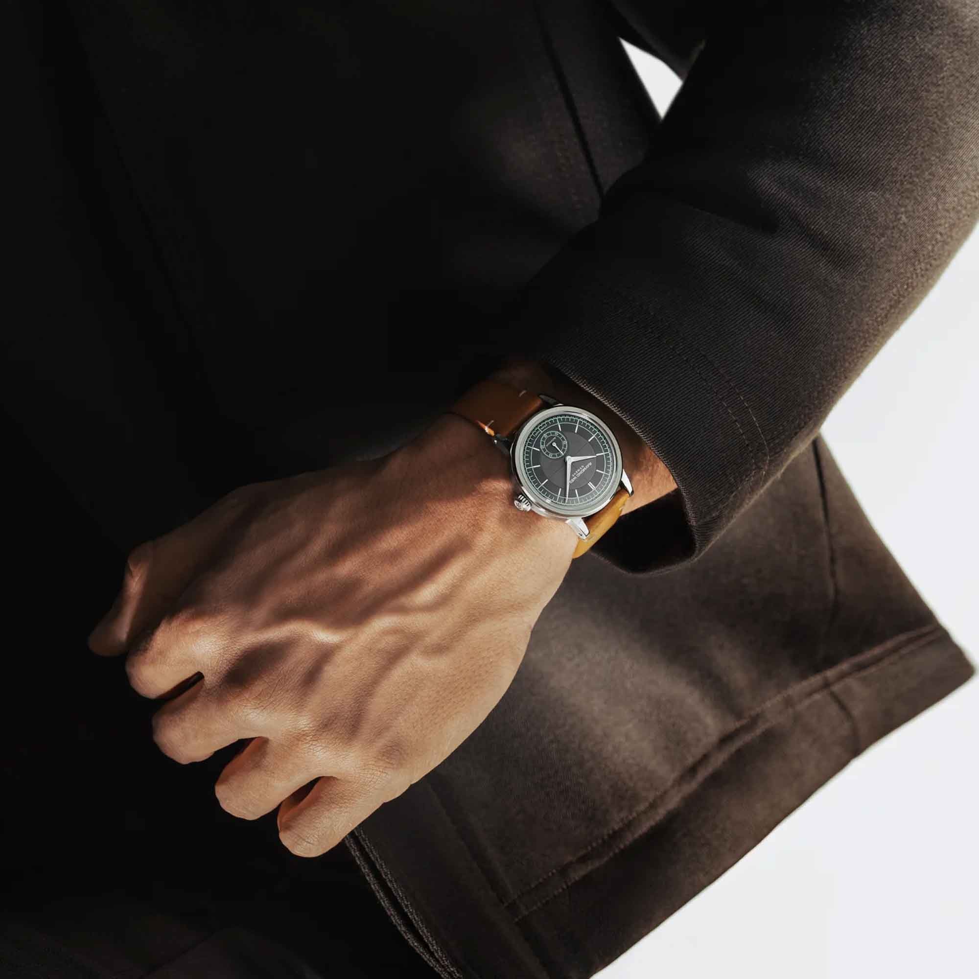 The anthracite sector dial features silver-toned hands with Super-LumiNova®, ensuring excellent visibility. Discrete tracks indicate hours, minutes, and seconds, enhancing readability. The intricately finished dial, with a snailed menthol minute track and a delicately brushed central area, offers depth and detail.