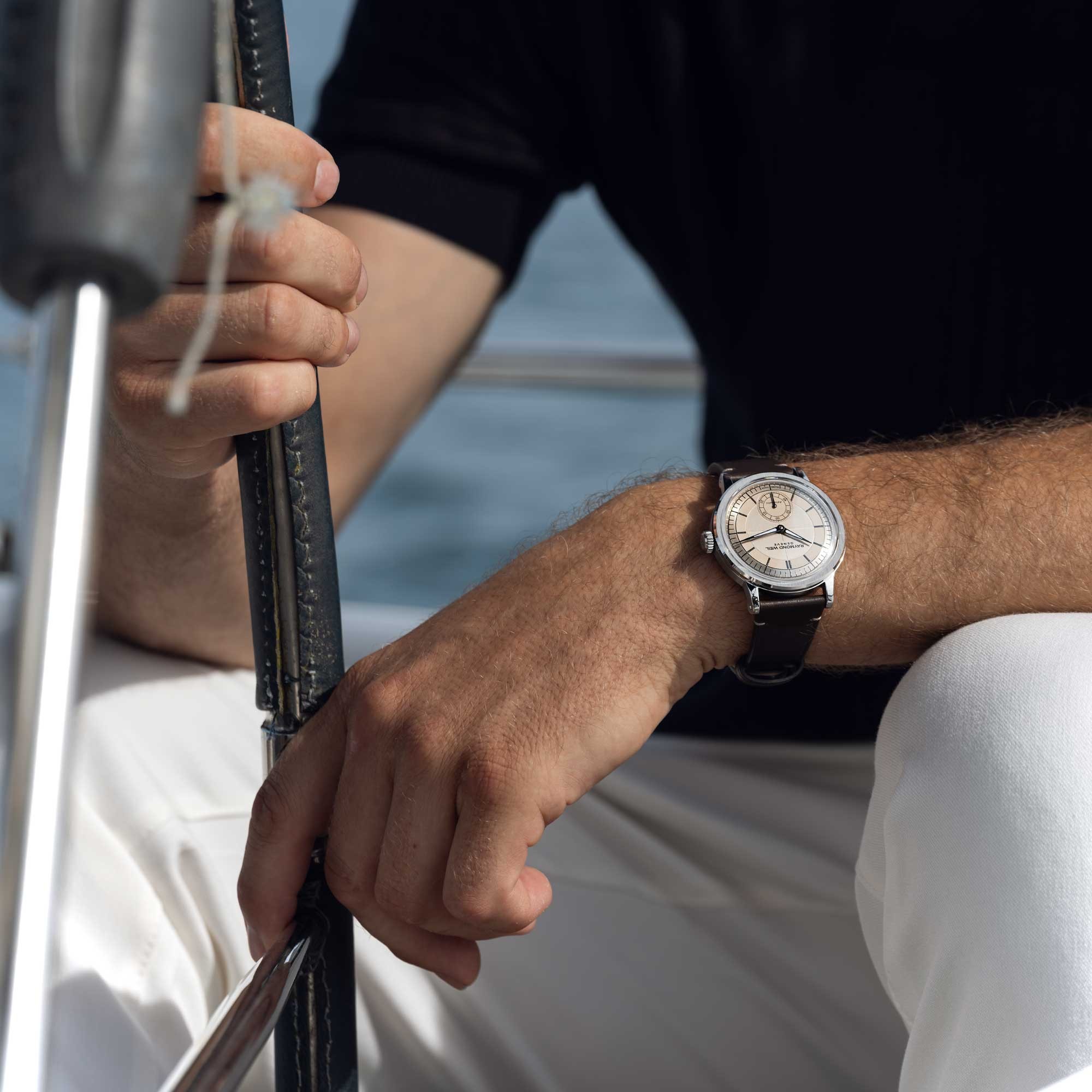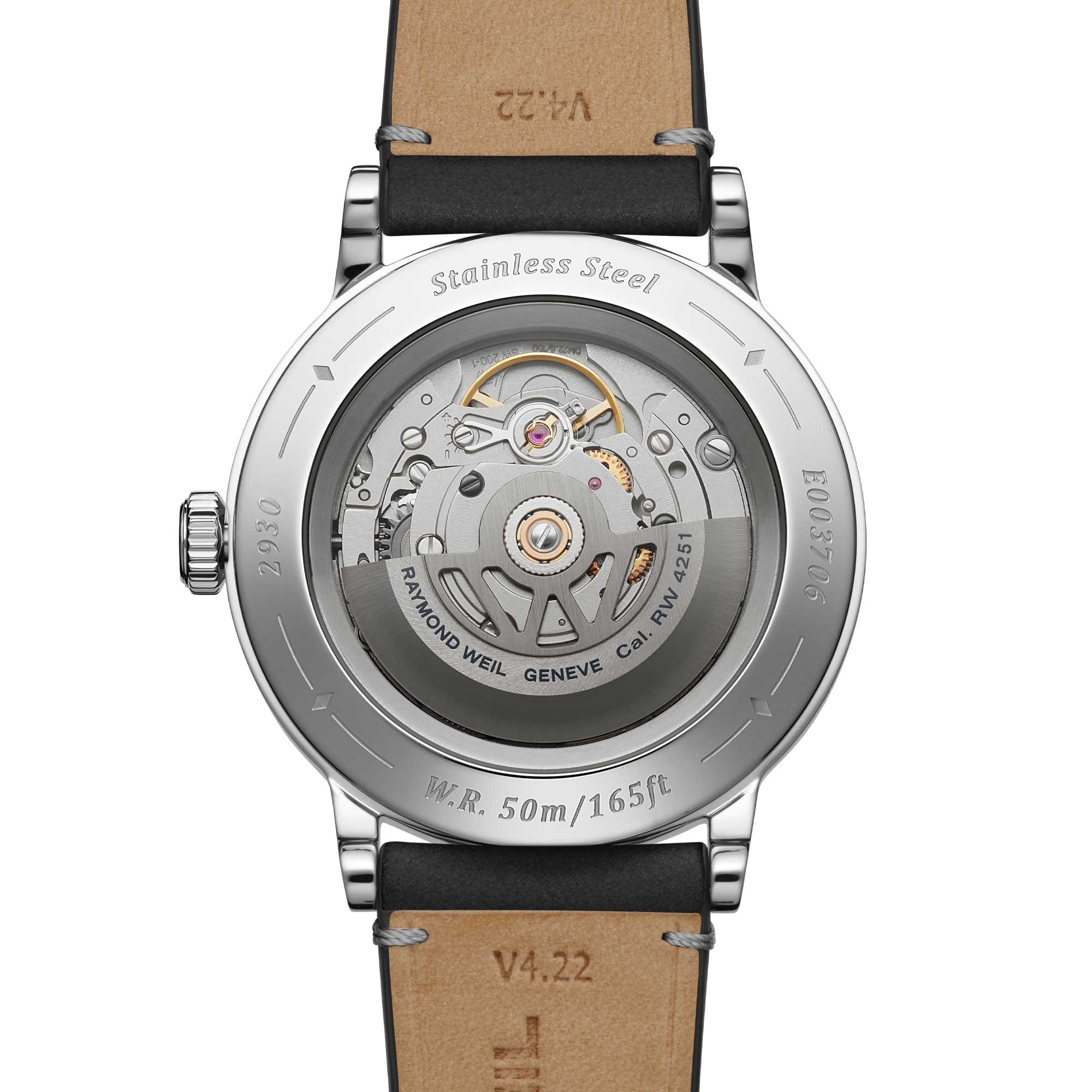 A sapphire caseback affords sight of the self-winding movement within and the “W-shaped” oscillating weight, RAYMOND WEIL’s horological signature. Offered in a selection of dial colours, each model is paired with a colour-coordinating genuine calf leather strap with a unique W-stitched detail.
