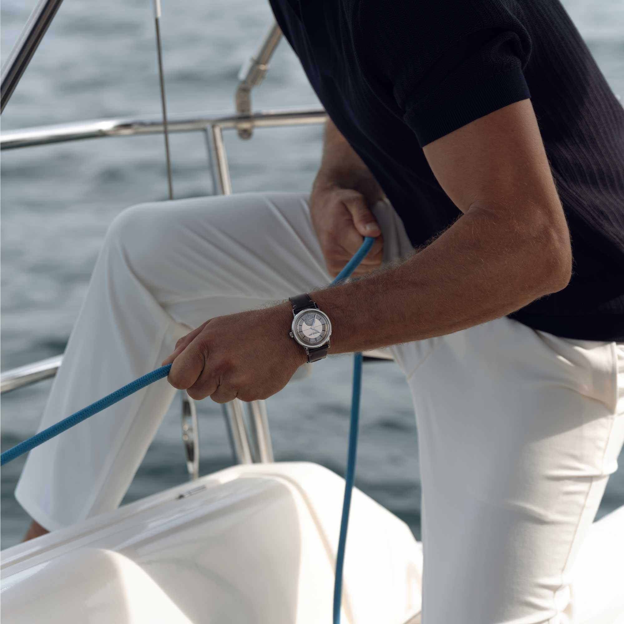 The champagne dial, located beneath a vintage-inspired sapphire crystal glass-box, has been refined to the highest degree. The hours and minutes are eloquently conveyed with silver-toned hands, lined with Super-LumiNova®. The sector dial presents the hours, minutes and seconds periods on discrete tracks, augmenting readability.
