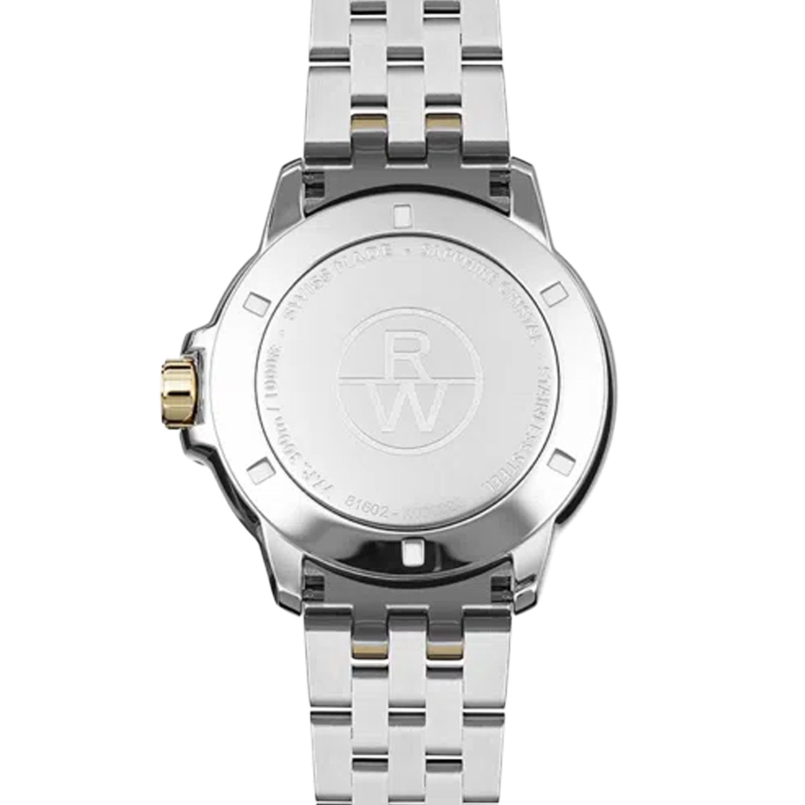 The hours are denoted with slim batons and a central seconds hand has been added for precision. The screwed-down crown, enabling water resistance up to 100m, features the RW monogram.