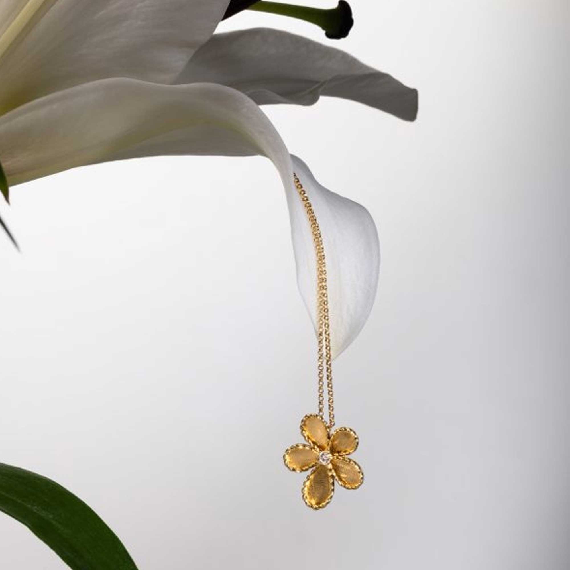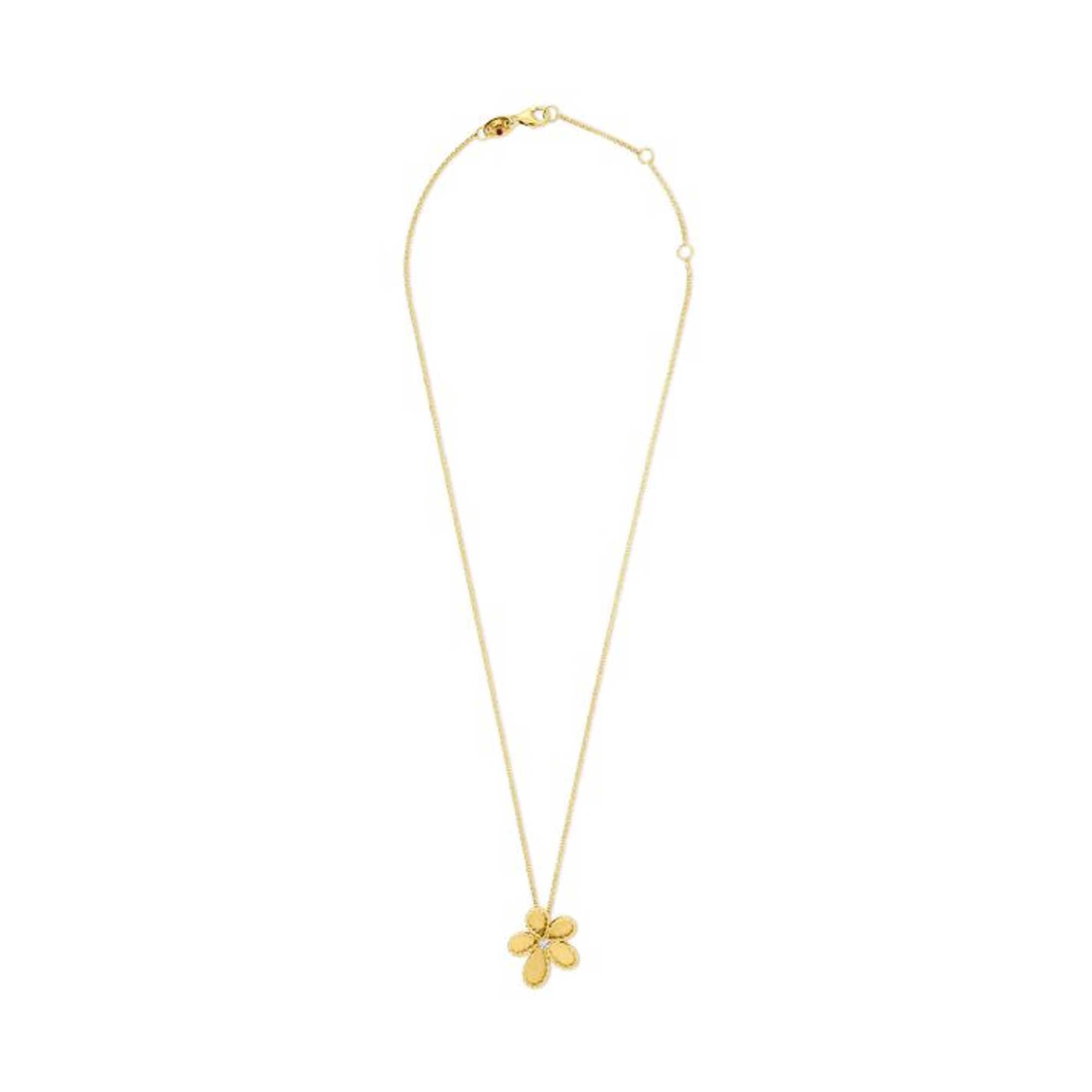 The Roberto Coin 18ct Yellow Gold Jasmine Diamond Pendant ADR777CL3646 is a refined necklace for her with a floral silhouette. Crafted in rich 18ct yellow gold, it sits neatly on the neckline and pairs with occasion wear or everyday looks.
