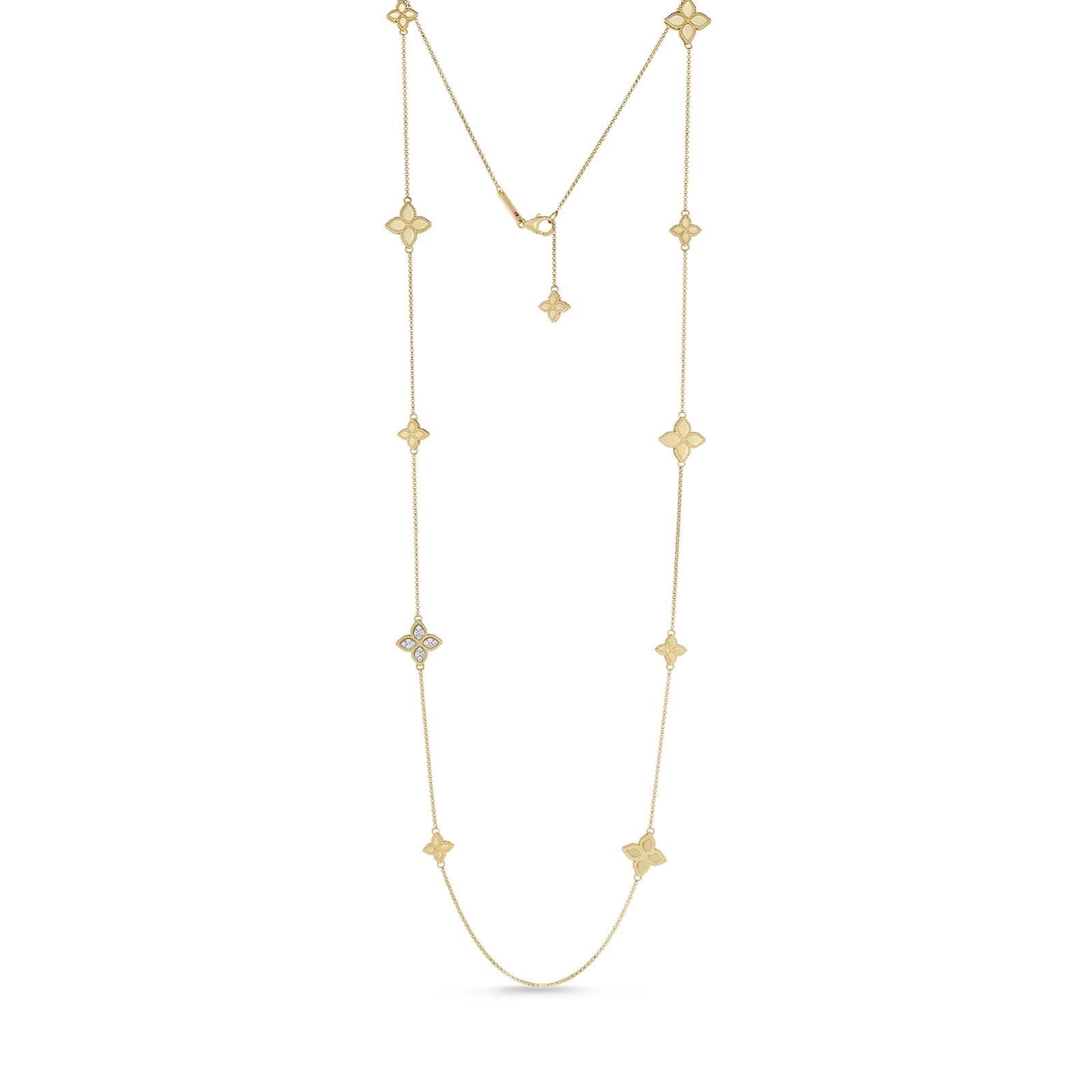 Channel Venetian elegance in this 0.18ct diamond petal necklace from the Roberto Coin Princess Flower collection. The 85cm necklace holds the iconic Roberto Coin flower motifs, crafted from 18ct yellow gold with white gold petals, with some encrusted with round diamonds. Elevate the elegance of this piece by layering it with a Roberto Coin pendant.