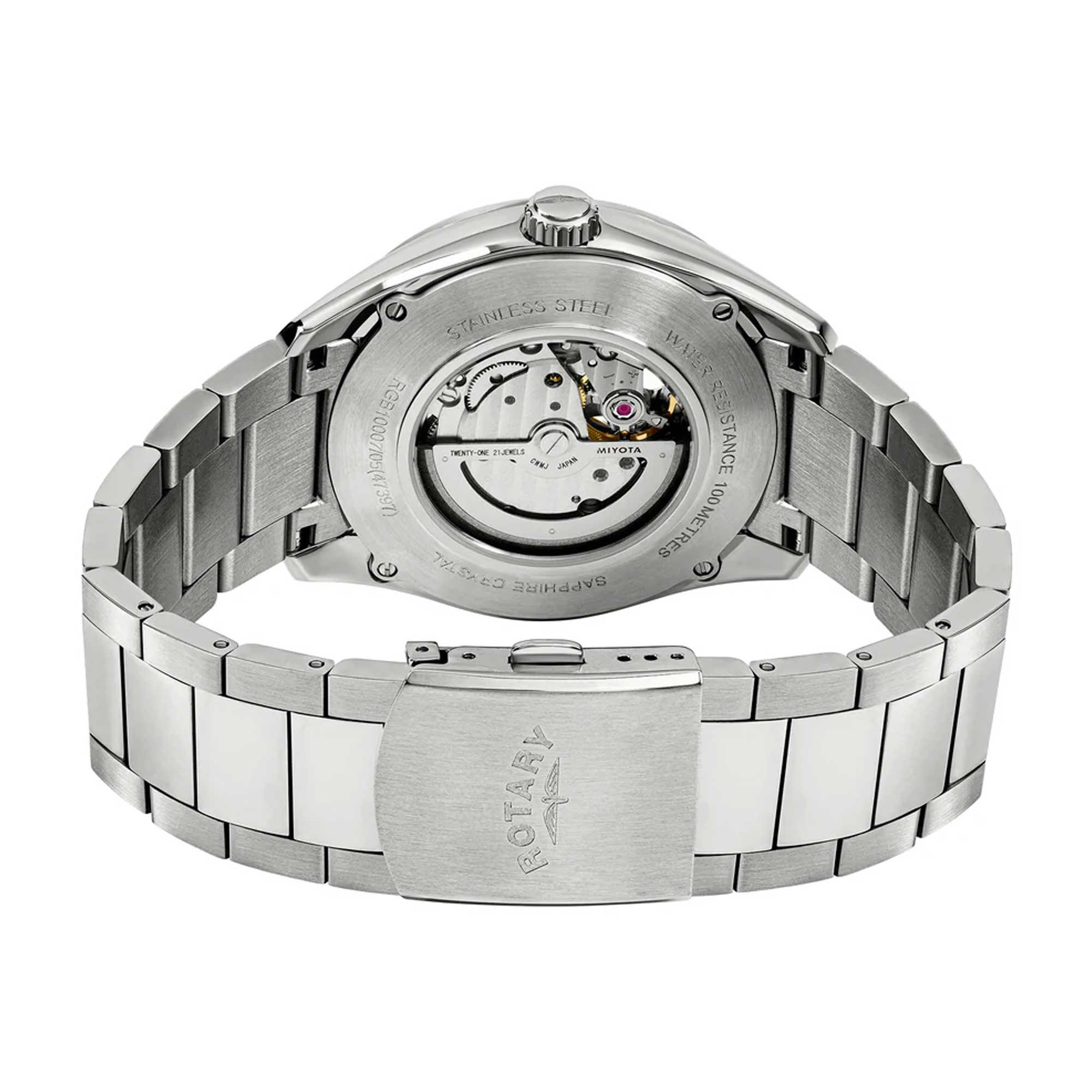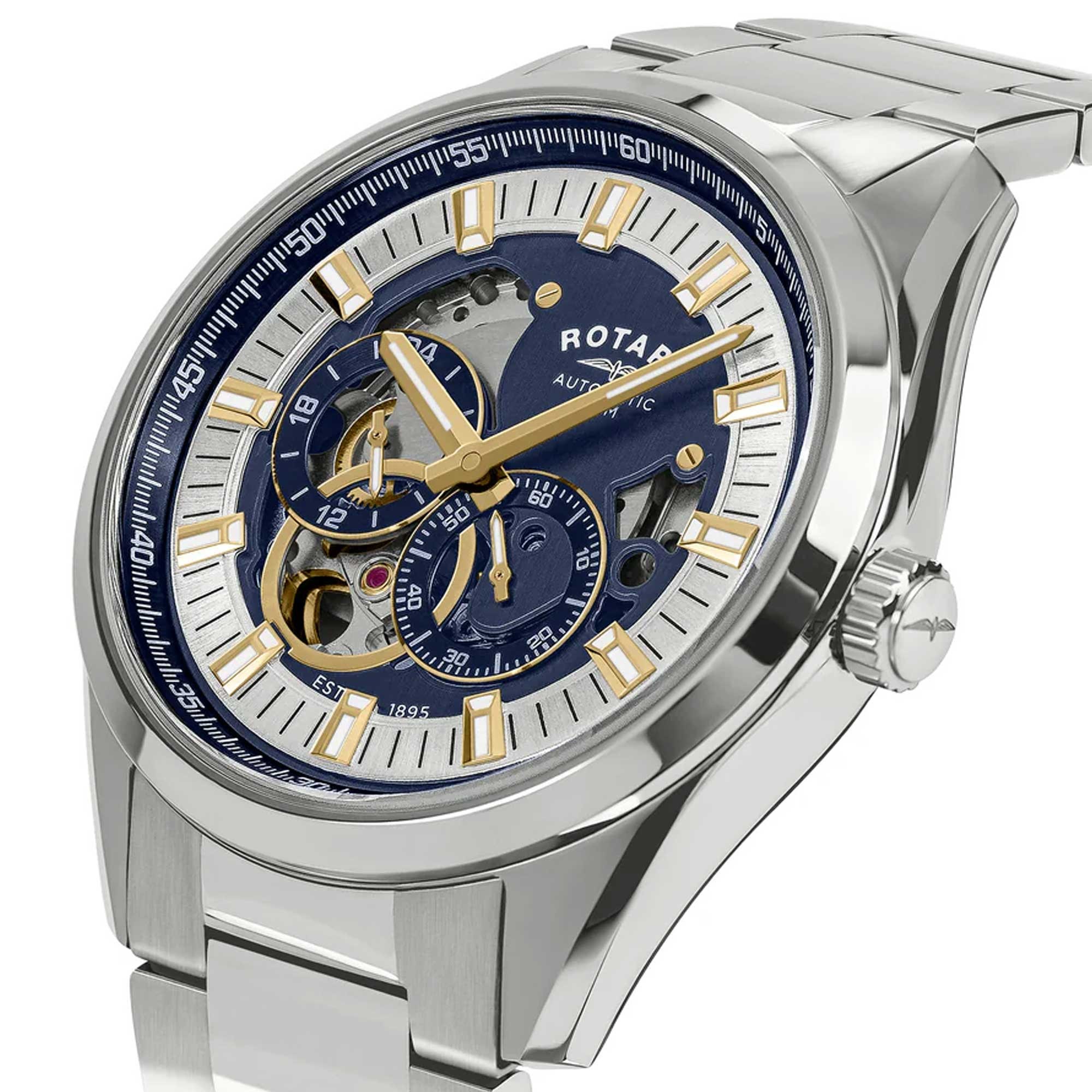 Polished gold-tone markers and hands contrast beautifully against the partially open-worked dial, while the 3-link stainless steel bracelet compliments the case and offers a premium feel. Designed for the discerning watch enthusiast, the Rotary Seamatic Eclipse balances modern watchmaking with timeless style.