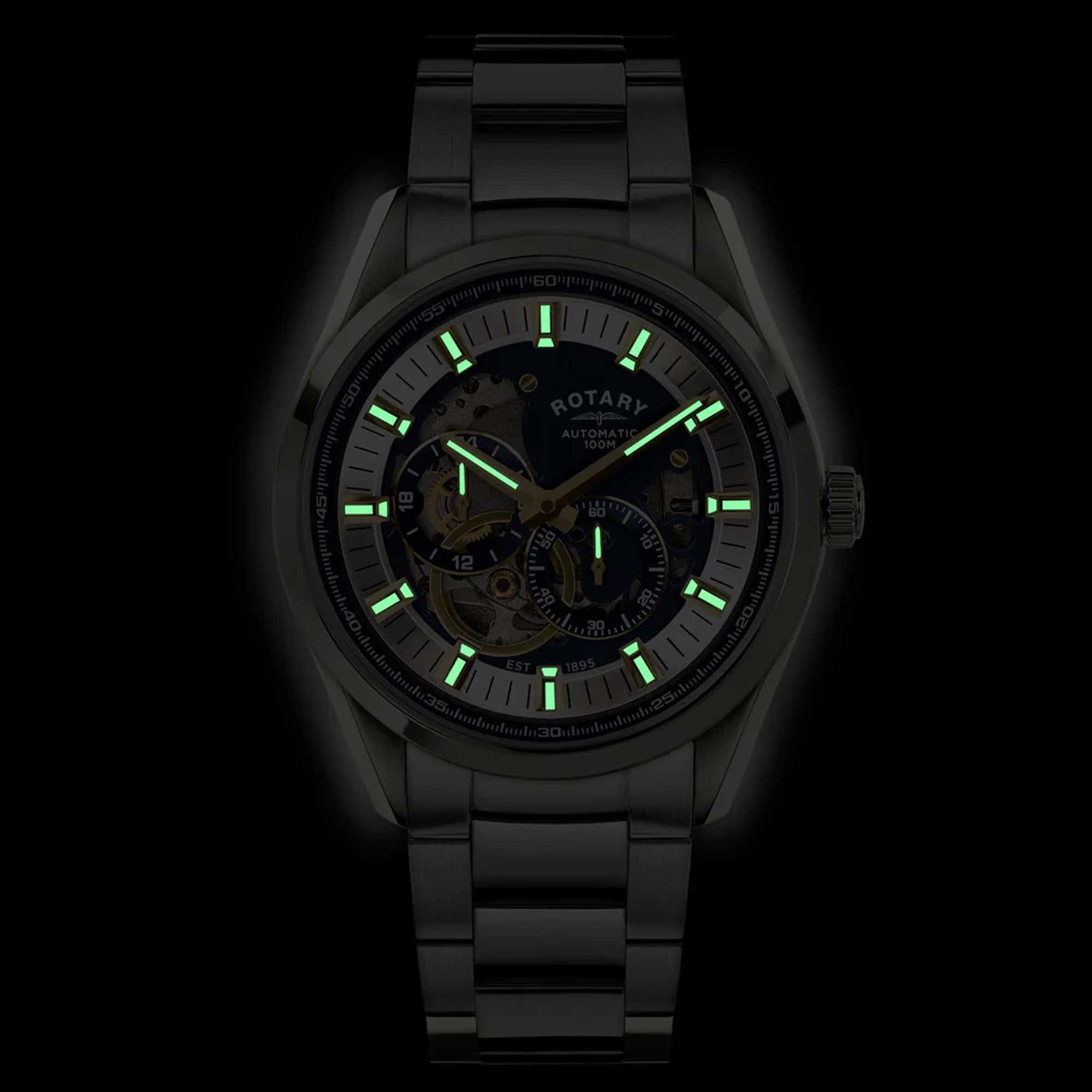 Unveil the inner workings of time with the striking Rotary Seamatic Eclipse. Framed in a brushed stainless steel case, this watch features an intricately skeletonised dial that offers a window into the self-winding automatic movement beneath. The inclusion of an exhibition caseback allows for a glimpse into the back of the movement and the rotor.