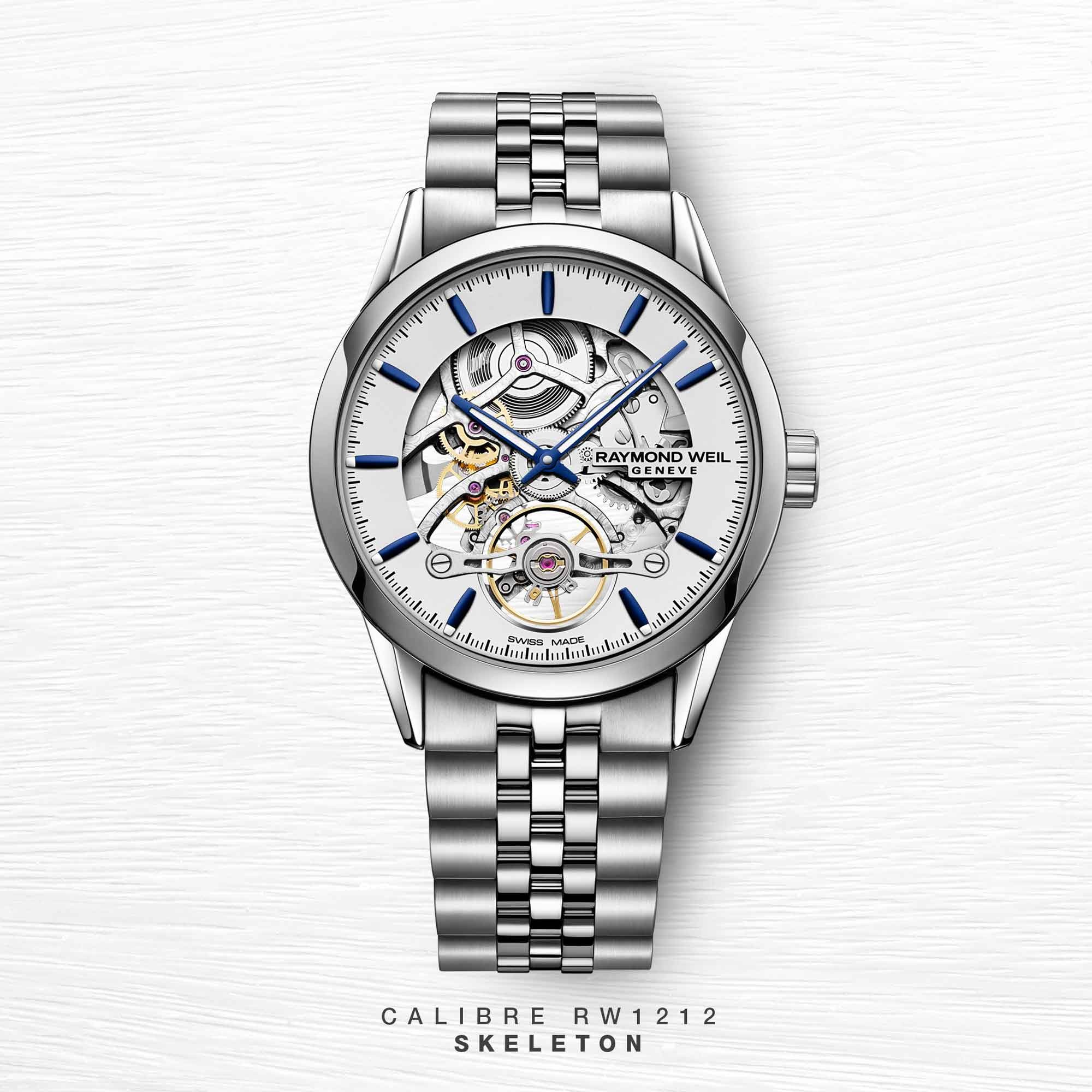Embark on a journey into the depth of the movement with RAYMOND WEIL’s first official skeleton watch, fitted with calibre RW1212 automatic movement, 41 hour power reserve and visible decorated movement. Sleek and stylish, this freelancer Skeleton showcases the Brand’s watchmaking know-how. It alternates between see-through components and sophisticated polished details which catch the light. It’s completed by a stainless steel bracelet with folding clasp with double push-security system. This exceptional freelancer skeleton timepiece is sure to make an impression.