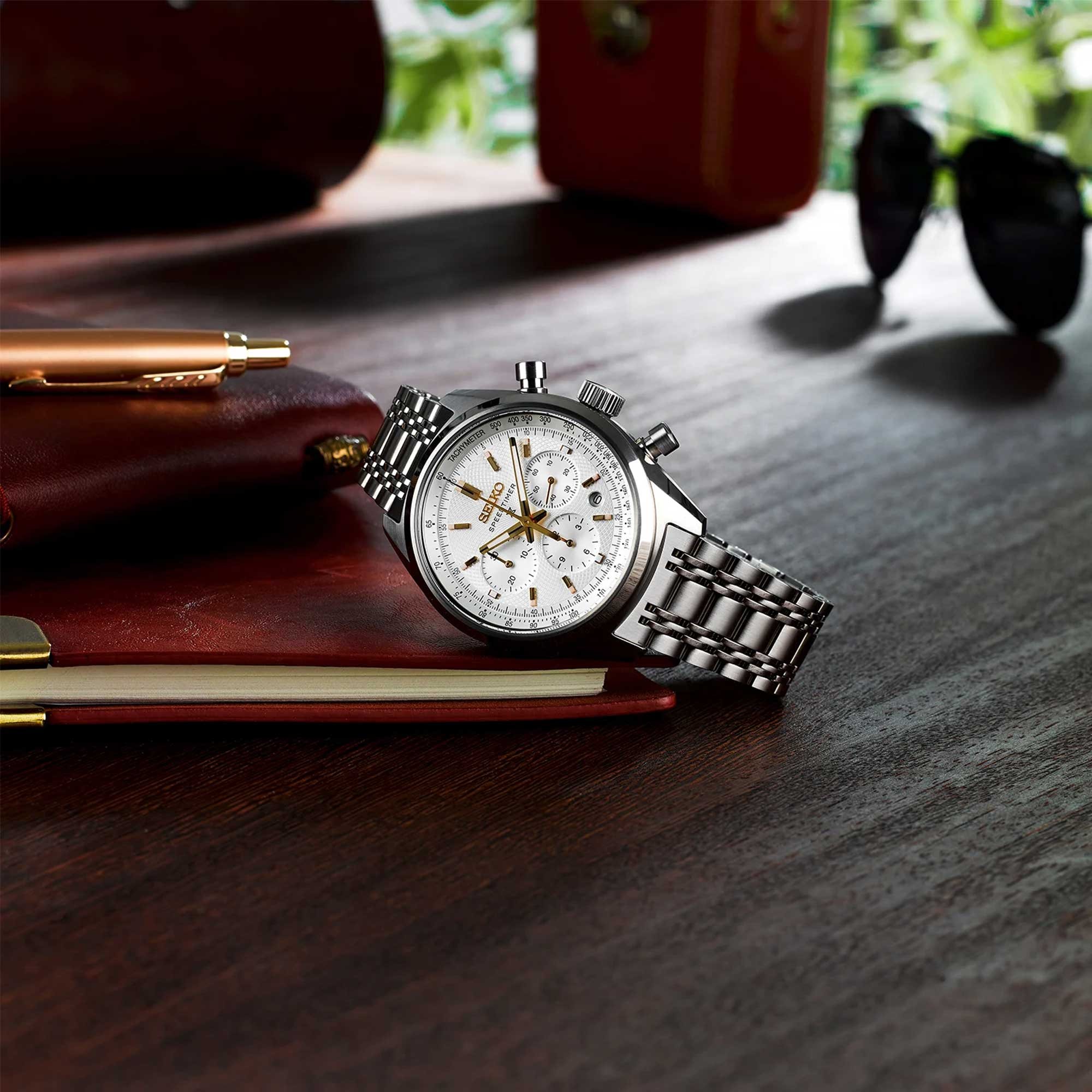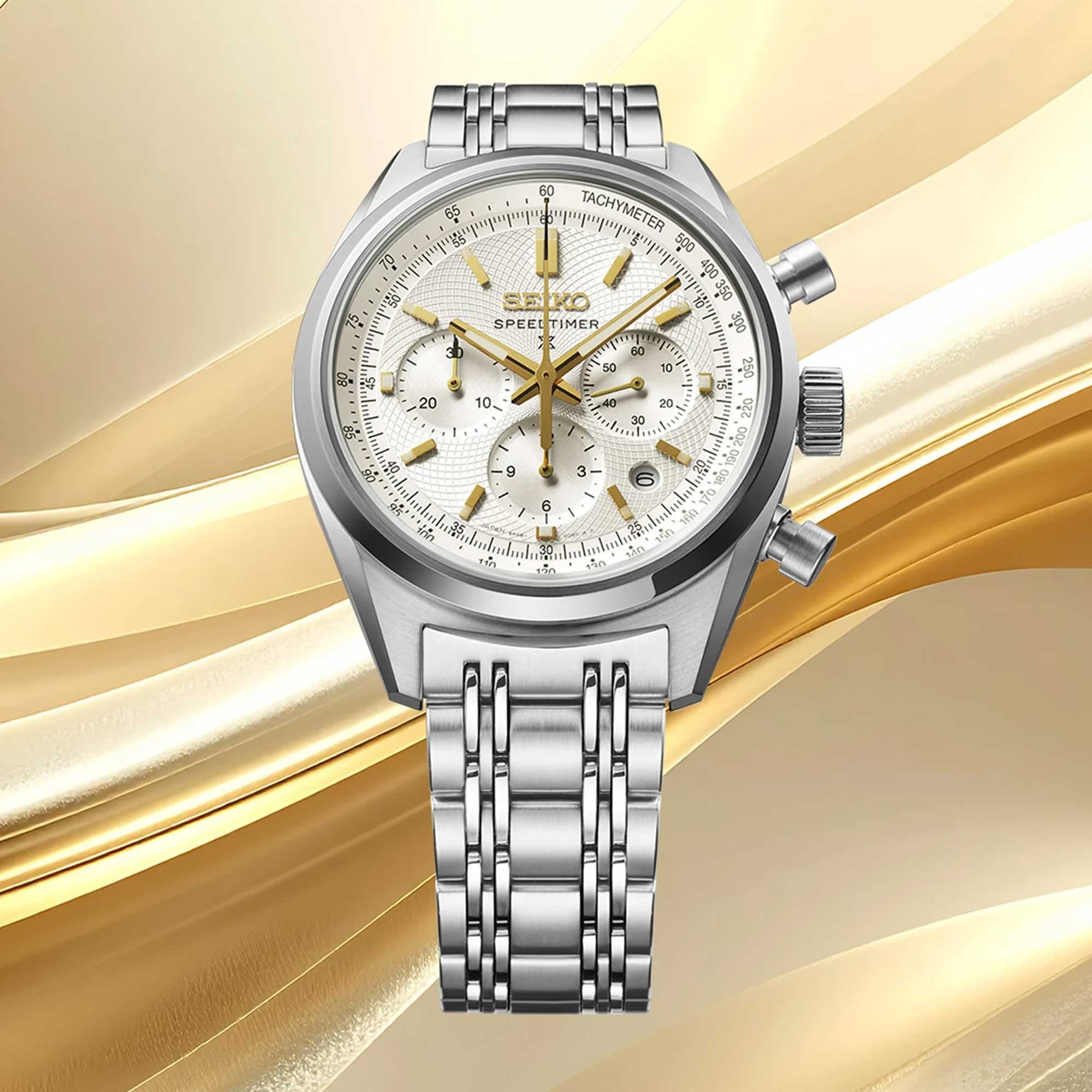 The Seiko Speedtimer was a major innovation milestone in 1969 – the world’s first automatic chronograph watch with column wheel and vertical clutch. This 2026 design is inspired by a classic from the archives; the 1972 Seiko 'Panda'. Under dual-curved sapphire glass, the classic silver-white dial features elegant gold-coloured accents for legibility. The dial pattern pays homage to the original Japanese pocket watches of the 1890s, when Seiko moved from repairing clocks and watches to creating them.