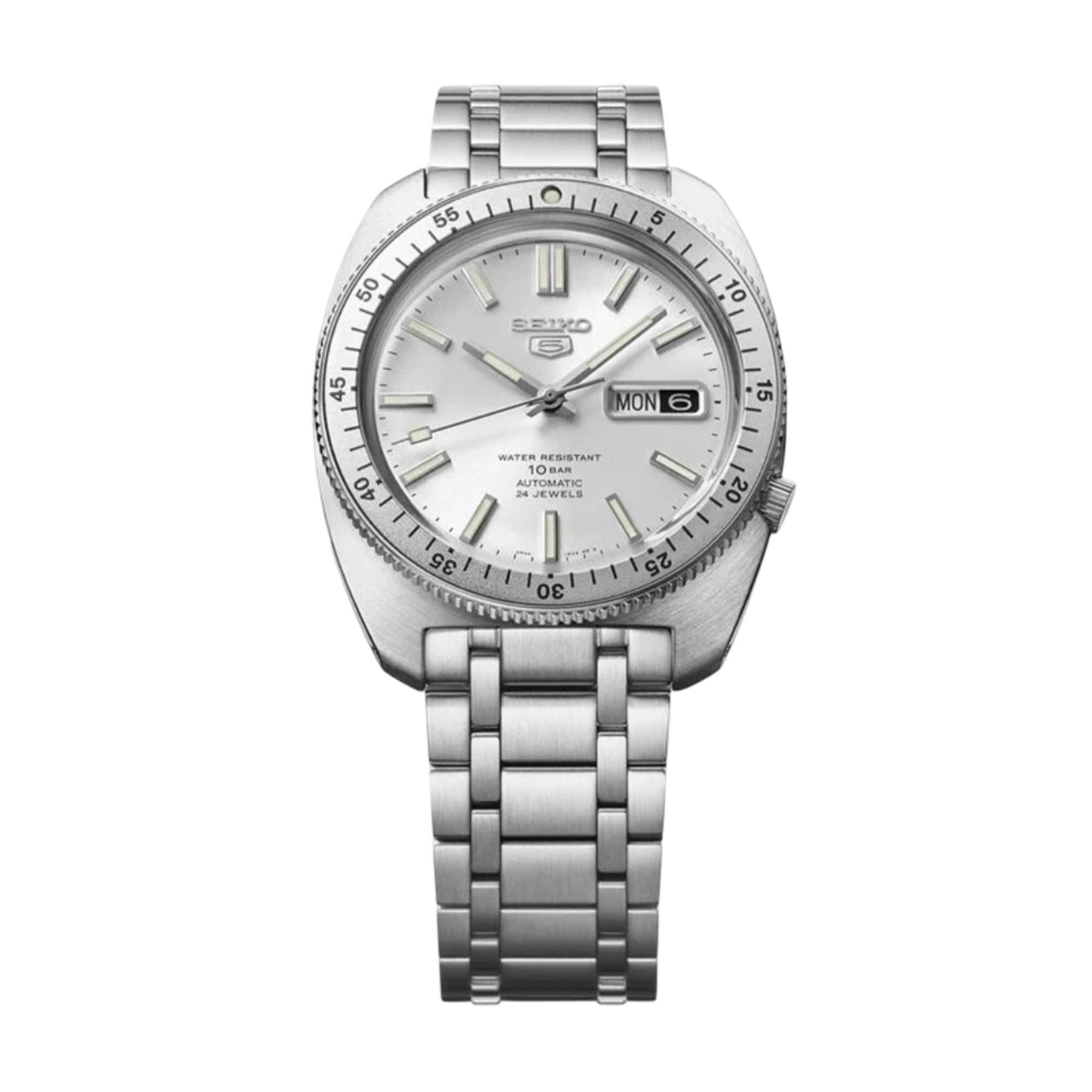 Similar to its 60s inspiration, it features a bi-directional bezel, the vintage Seiko 5 emblem logo on the silver tone dial with a black and white day-date feature and a multi-link bracelet for intricacy and sparkle.