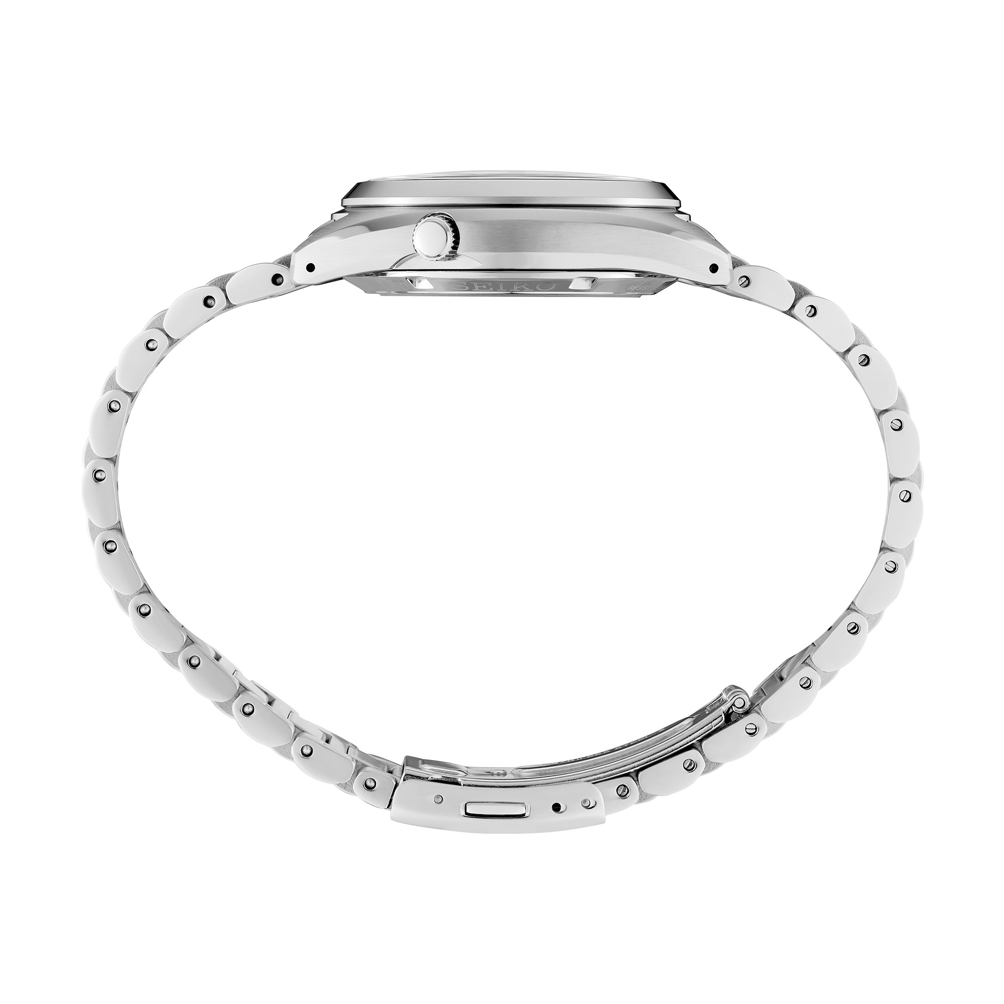 Under a semi-spherical glass, the dial features Lumibrite hands and indices, each diamond-cut with finely grooved lines, on a ‘deep black wash’ colour dial. The hands are non-triangular and are wider, to enhance the vintage retro look whilst the orange second hand is inspired by the classic 70s design. With a metal dial ring, the bracelet features striking mirror and hairline finishing.
