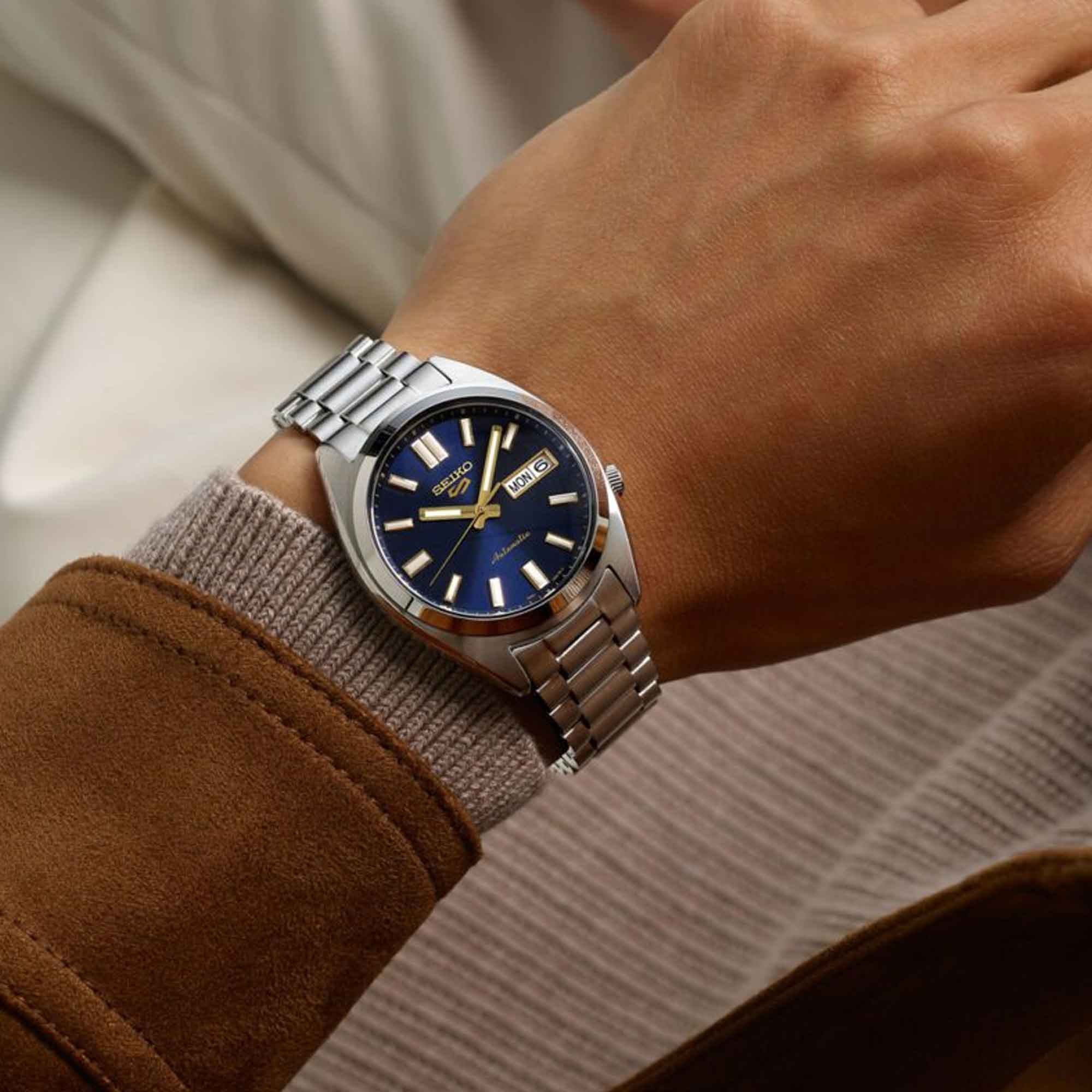 The dial features white Lumibrite hands and indices for a crisp modern look, on a blue ‘blazer’ coloured dial. The gold-coloured hands and indices are non-triangular and contrast with the coloured dial for an elegant aesthetic. The gold accents are designed to be easily matched with classic fashion looks such as gold blazer buttons.