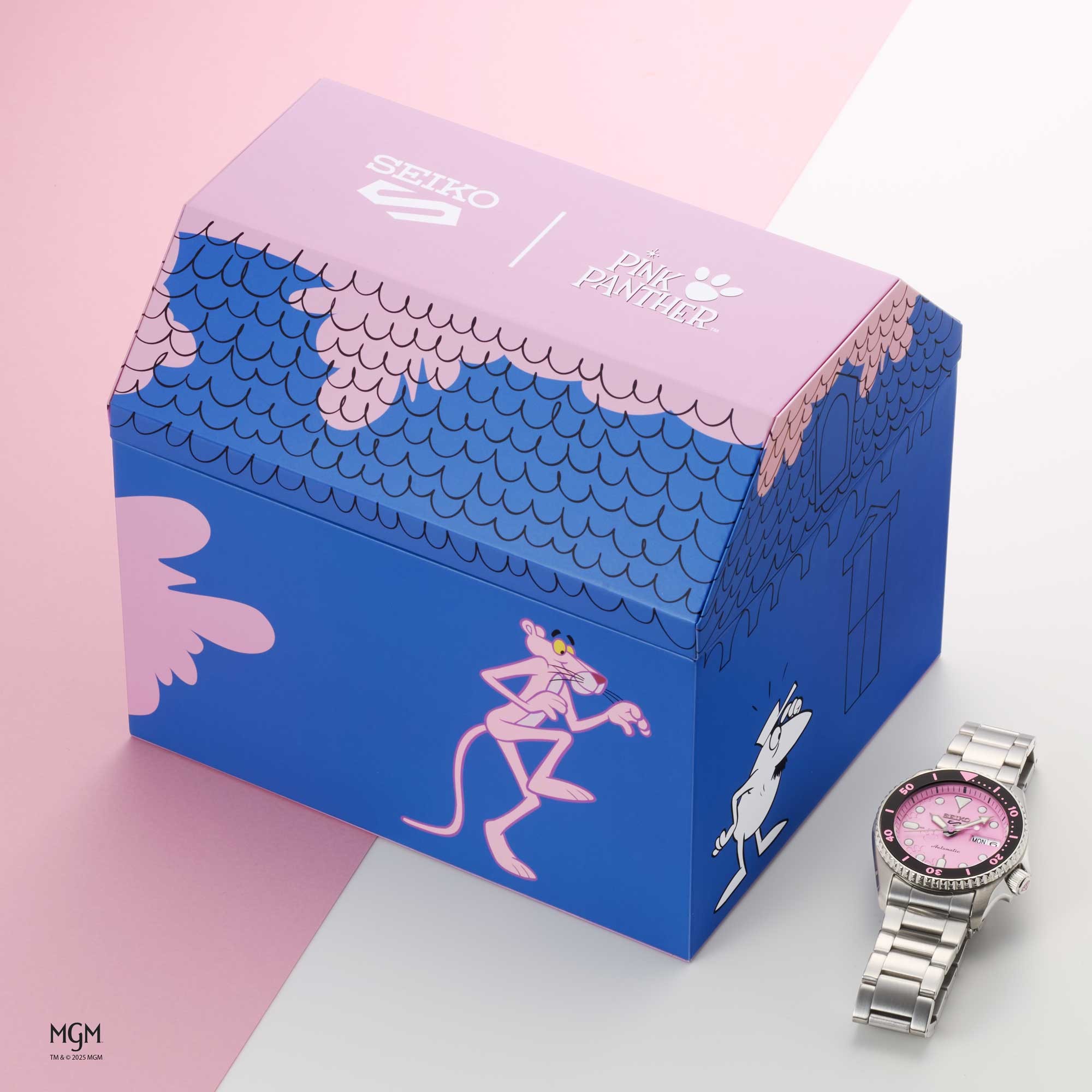 The watch arrives in a playful blue and pink house-shaped box inspired by the ‘Pink Phink’ cartoon setting, featuring images of the Pink Panther himself and Inspector Clouseau.