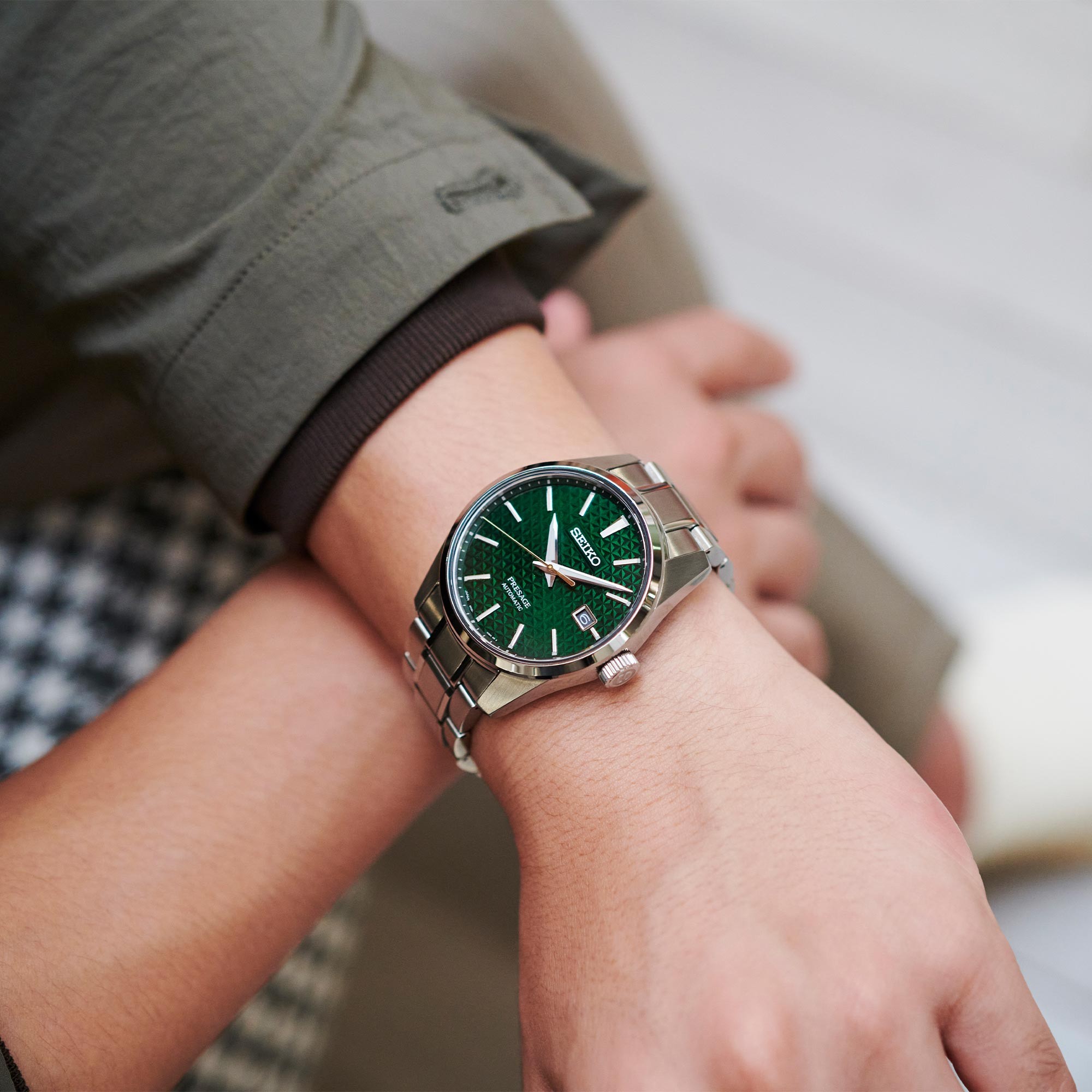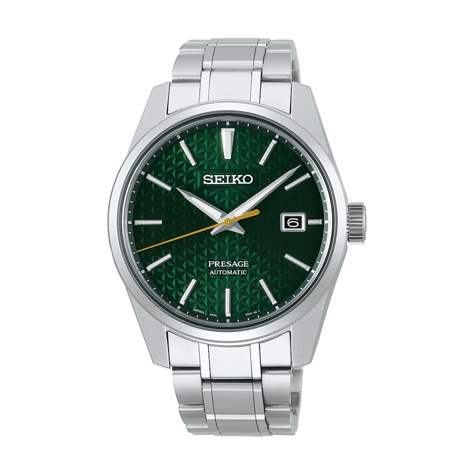 A timeless design for versatile wear, this Seiko Presage Sharp Edged Mens Watch SPB169J1 takes inspiration from the ancient Japanese plant hemp. The striking green dial with triangular hemp design is held within a sleek 39mm stainless-steel case on a steel bracelet. This timepiece is powered by the impressive calibre 6R35 automatic movement.