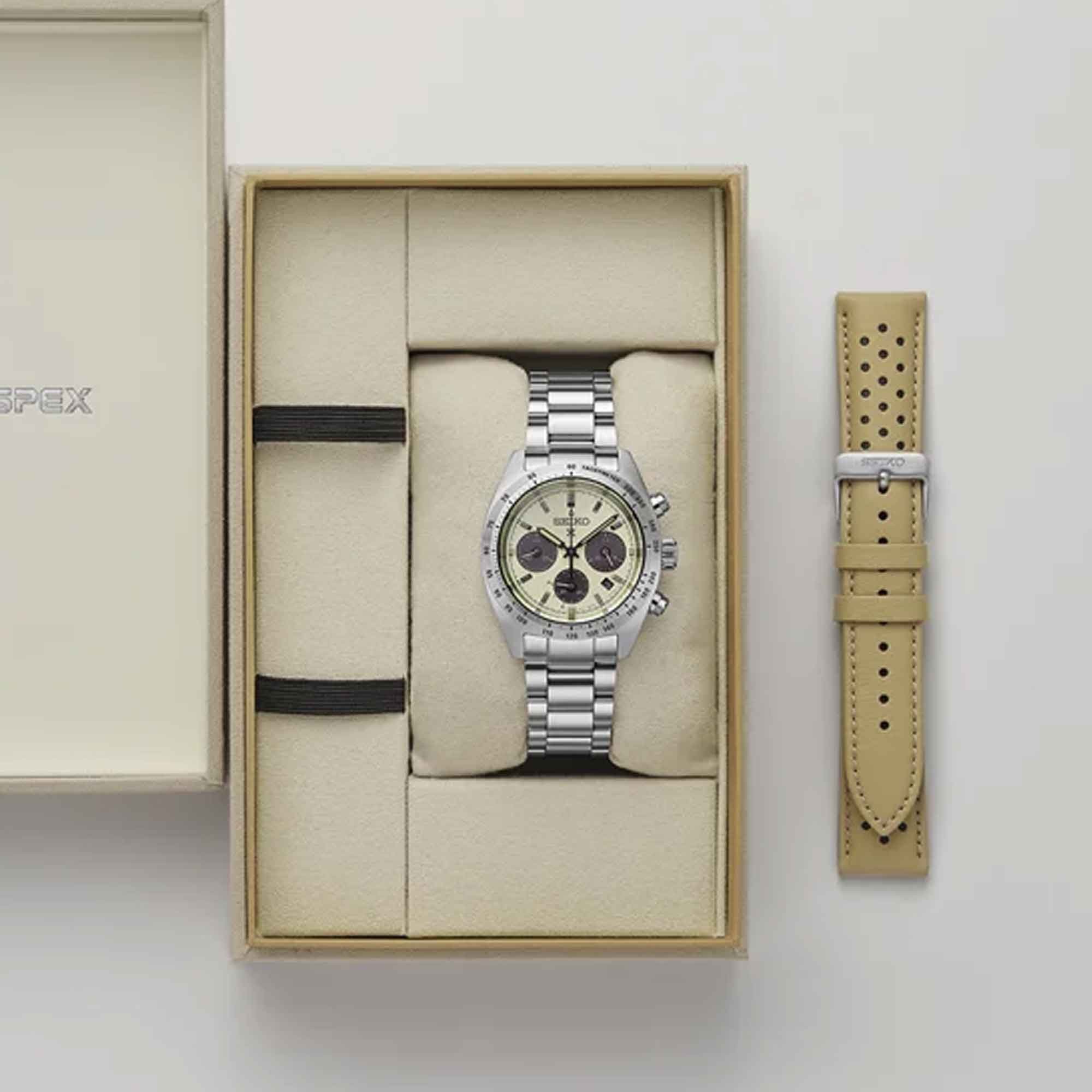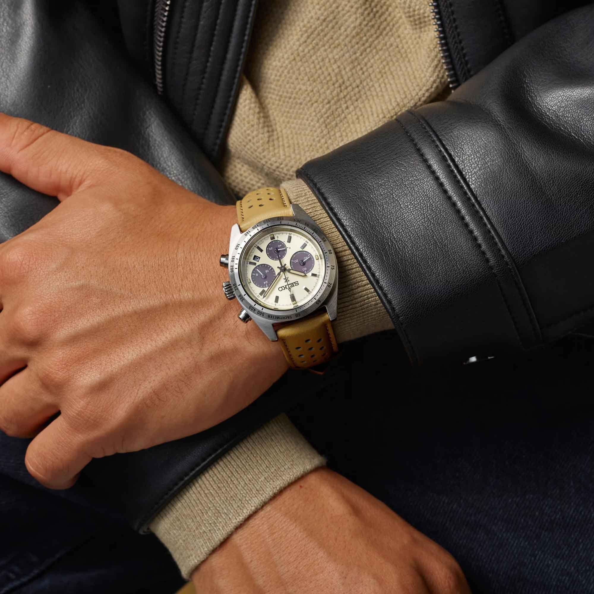 The cream dial of this Seiko Prospex Speedtimer is inspired by European classic cars. Under a curved sapphire glass is a sunray patterned dial, embodying the essence of luxury vintage motoring. Modelled on the SSC813, this Speedtimer inherits the fan-favourite Seiko ‘Panda’ style design, with black subdials to contrast the main dial, it’s paired with an additional light brown punched leather strap, resembling the sleek leather interiors of heritage automobiles.