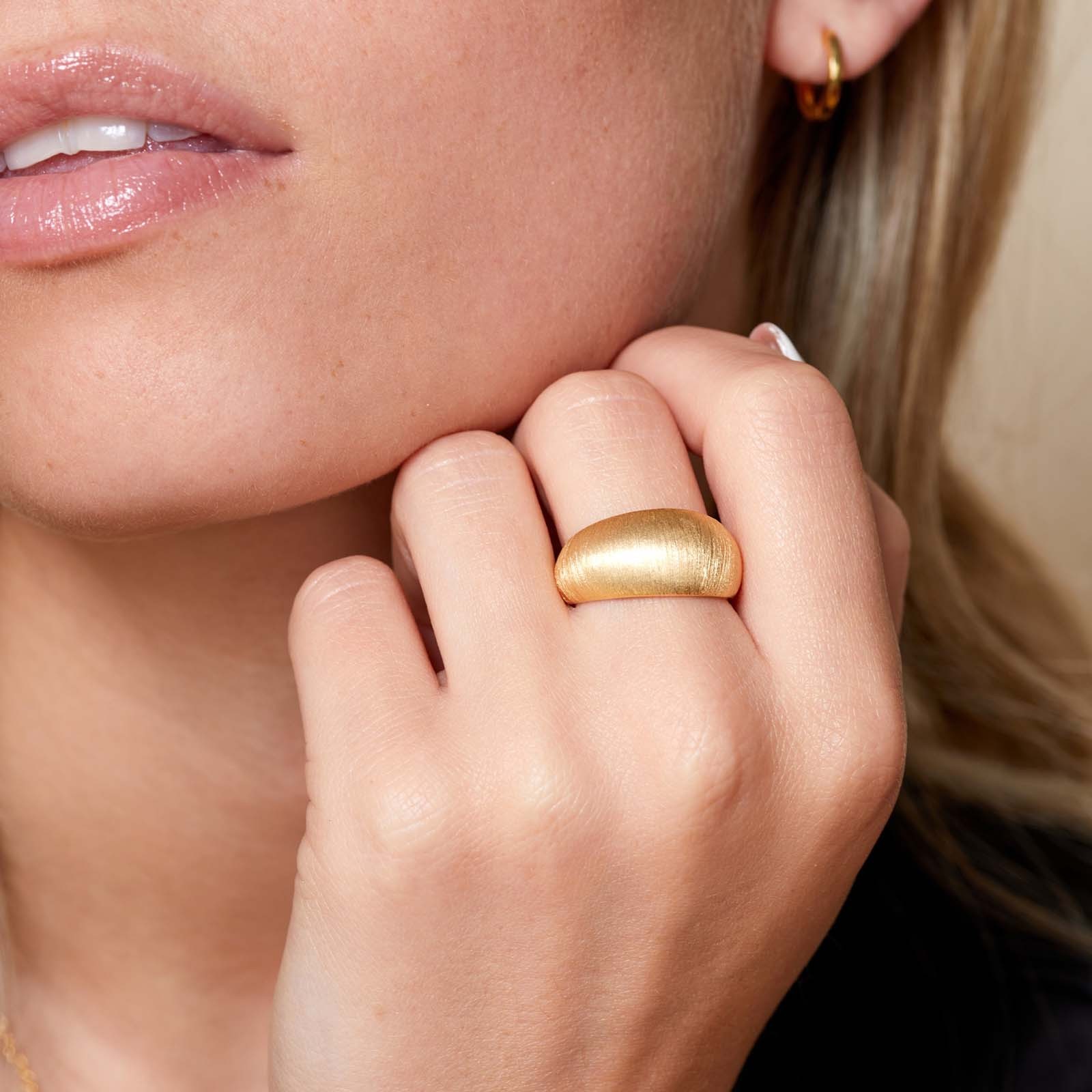 Introducing the Yellow Gold Plated Brushed Domed Ring from Chisholm Hunter, a striking piece designed for her. This ring features a sleek brushed finish that adds a contemporary touch to any outfit. Crafted from silver and plated with yellow gold, it offers a warm, luxurious appearance.