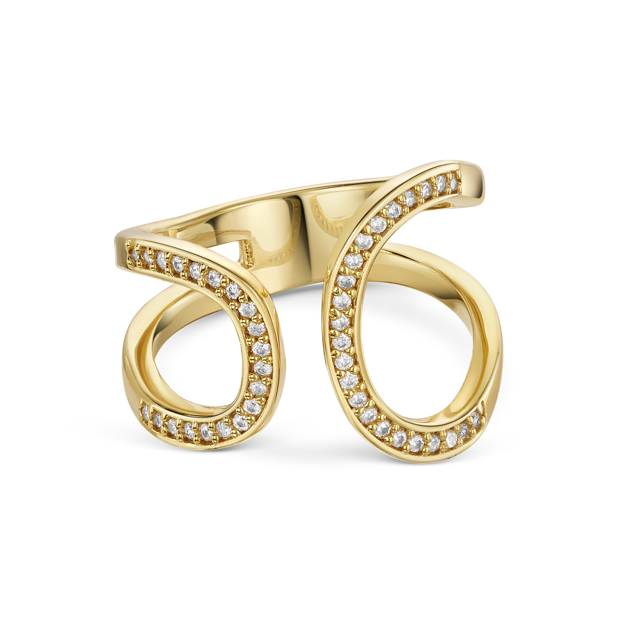 Indulge in the exquisite craftsmanship of the Yellow Gold Plated Cubic Zirconia Open Curve Ring, a stunning piece of jewellery designed exclusively for her by Chisholm Hunter.
