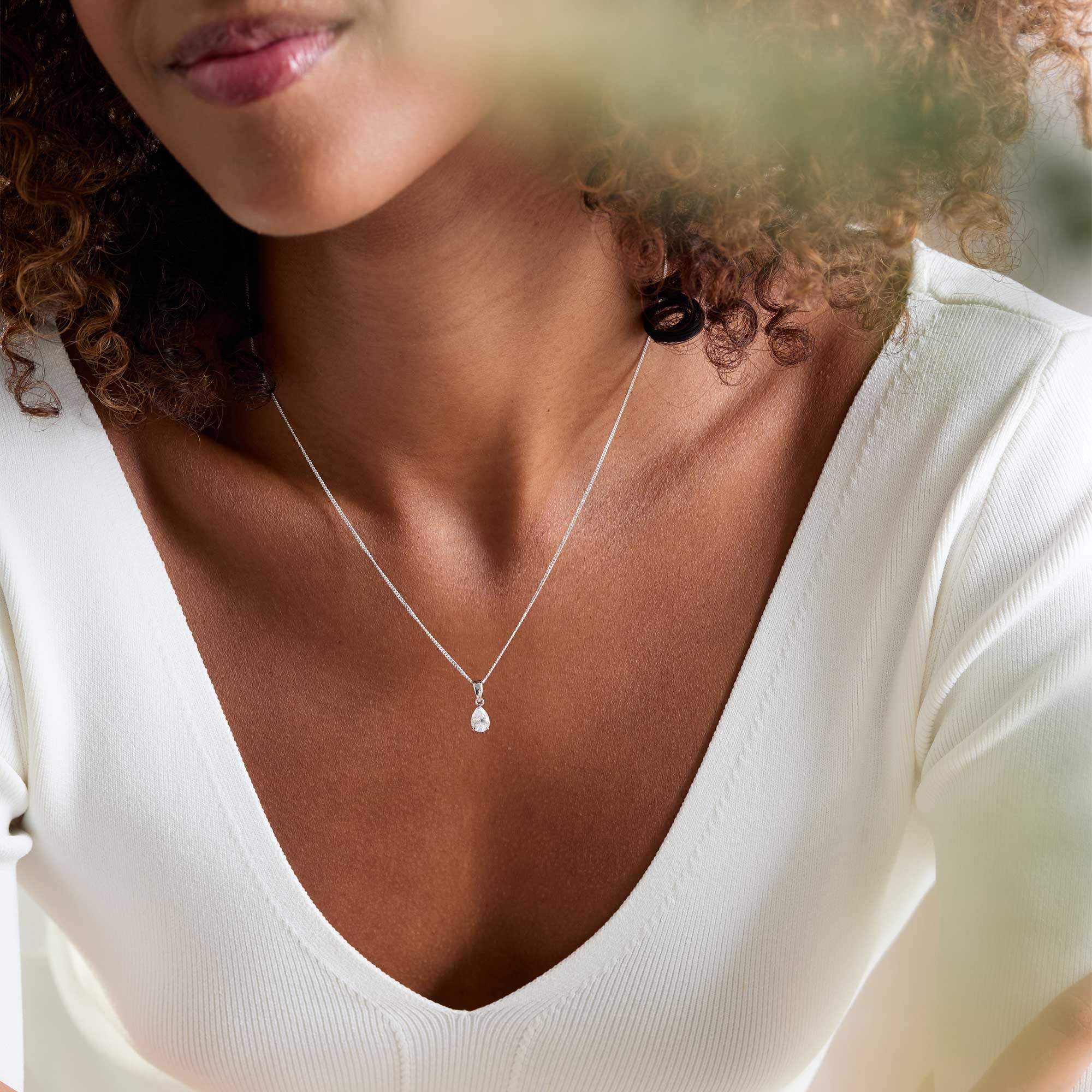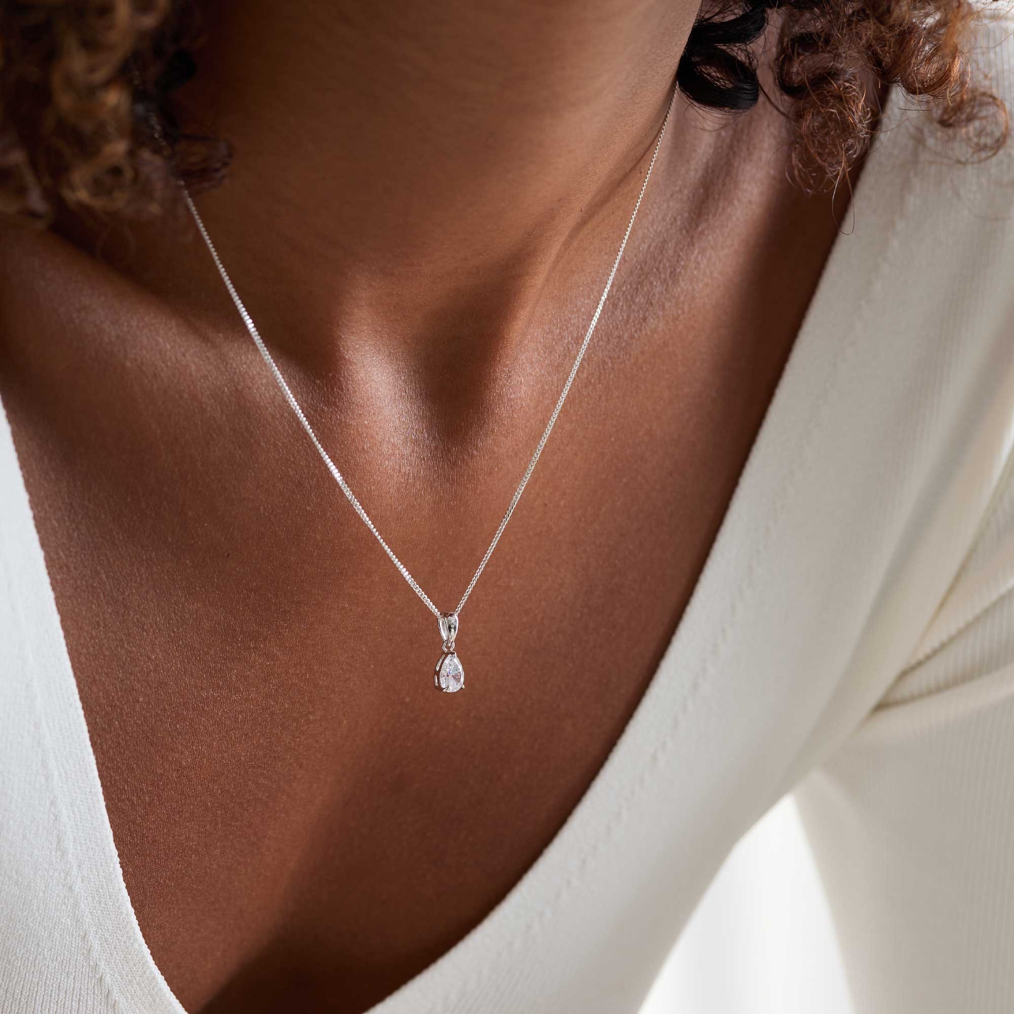 With a signature blend of quality and craftsmanship, this necklace is a lasting tribute to beauty. Embrace effortless elegance with the Silver Cubic Zirconia Pear Shape Solitaire Pendant, a true representation of refined taste and contemporary charm.