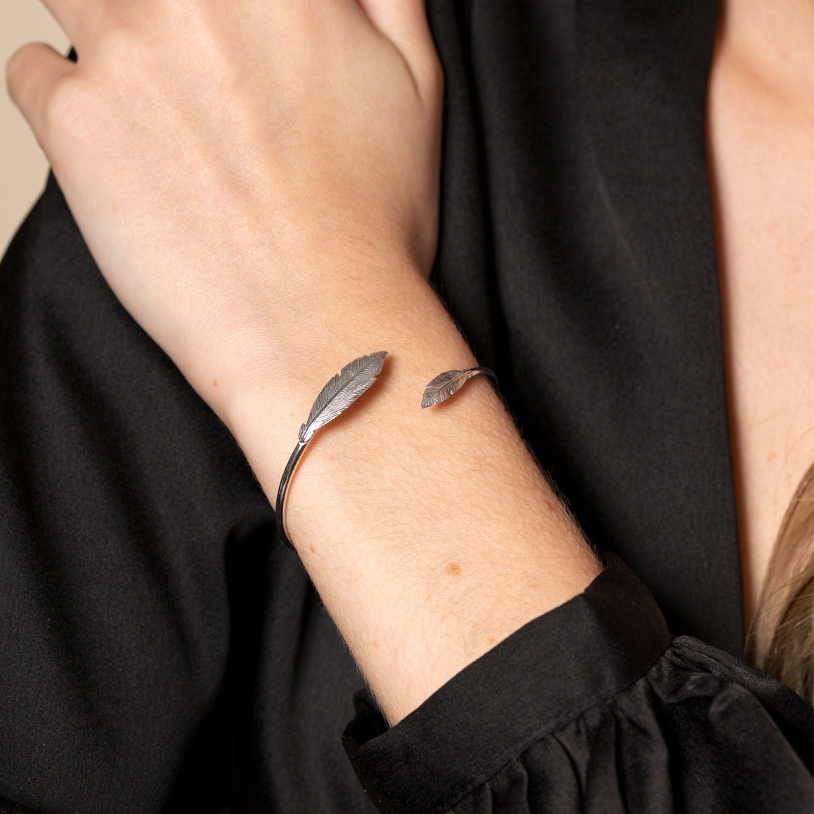 Spread your wings and fly with this silver double feather bangle. A gentle charm to wear on your wrist, perfect for yourself or a touching gift for a loved one.