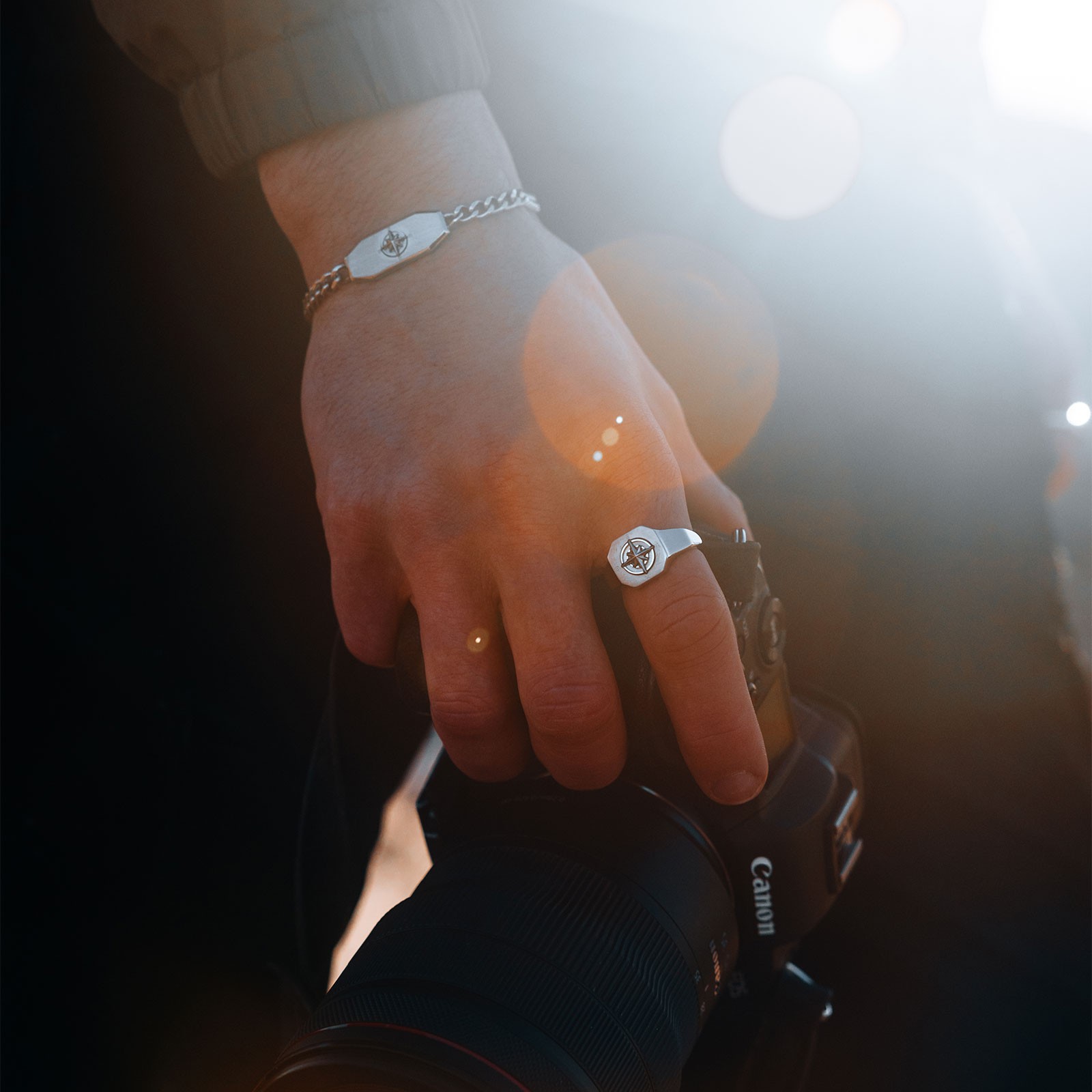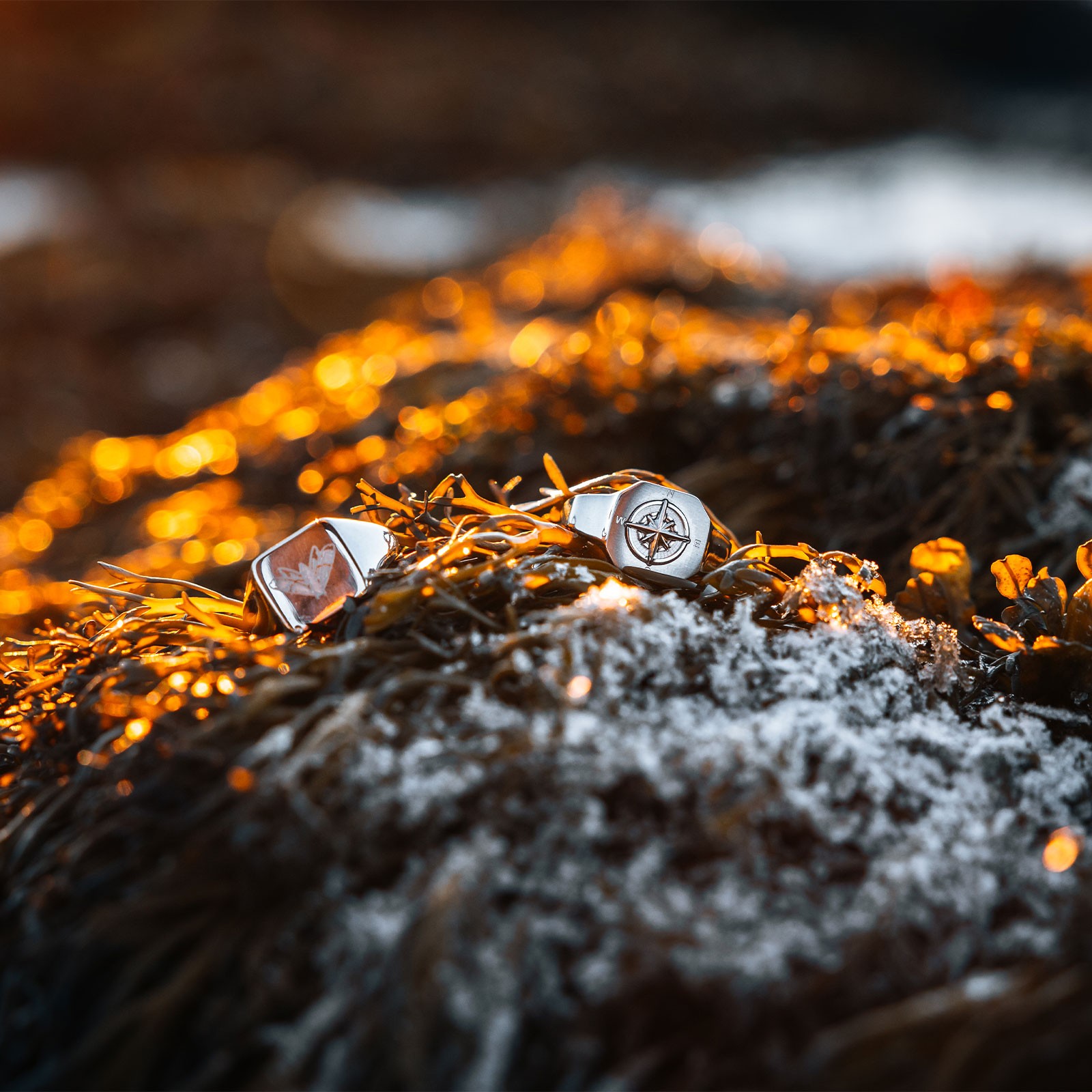 Introducing the Silver Gents Compass Signet Ring from Chisholm Hunter, a distinguished piece designed for the modern man. Made from high-quality silver, this ring seamlessly combines elegance with a sense of adventure.