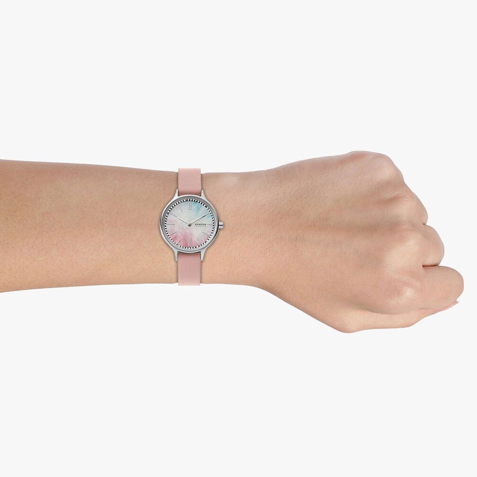 Rooted in the place where style meets simplicity, Skagen is a lifestyle brand inspired by the contemporary Danish design movement. Quality and a sense of purpose are the hallmarks of modern Danish design and these characteristics define Skagen. The Skagen Anita range is a collection of both Skagen is both graceful and elegant timepieces. Meaning 'grace' in Danish, this is the perfect way of describing this watch. A 30mm stainless steel case hosts a Mother of Pearl dial which perfectly contrasts with fine index hour markers and Roman numerals. Presented on a pink leather strap, this watch is powered by quartz movement and water resistant to 30 metres.