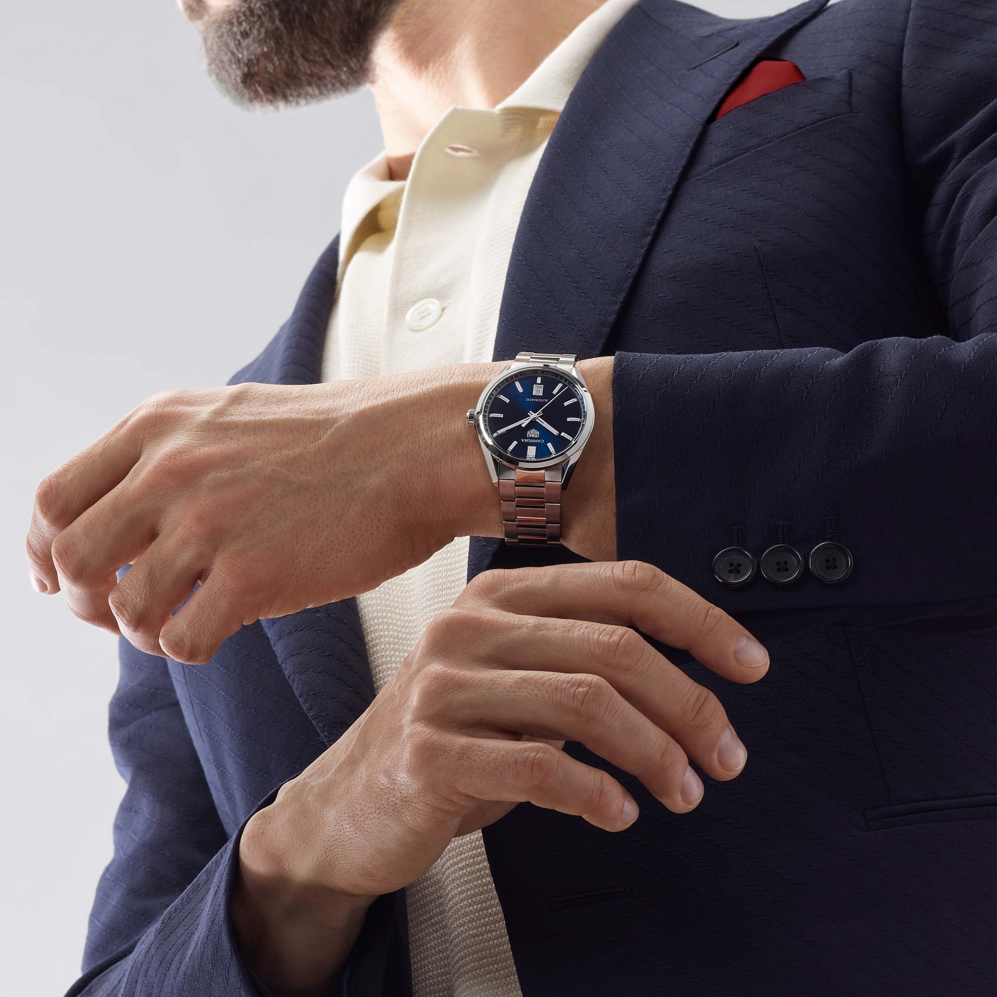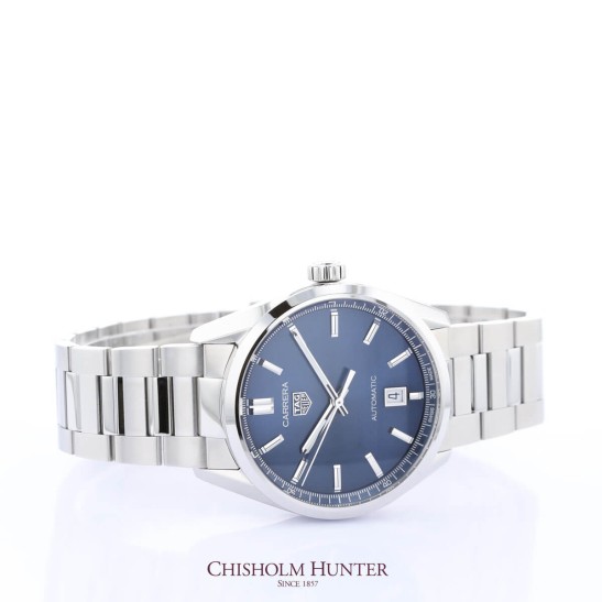 Striking luxury for driving whether for sport of for pleasure, the TAG Heuer 39mm Carrera Mens Watch WBN2112.BA0639 is ready to shop at Chisholm Hunter. Taking notes from the TAG Heuer legacy, this timepiece boasts the logo at 12 o’clock on the glistening blue dial with rhodium-plated indexes and hands and date window at 6 o’clock. The balanced design makes the watch easily readable while remaining distinct as part of the Carrera family. Increased comfort is considered in the redesign, with refined lugs and a more fitted bracelet. Powered by the incredible Calibre 5 automatic movement.