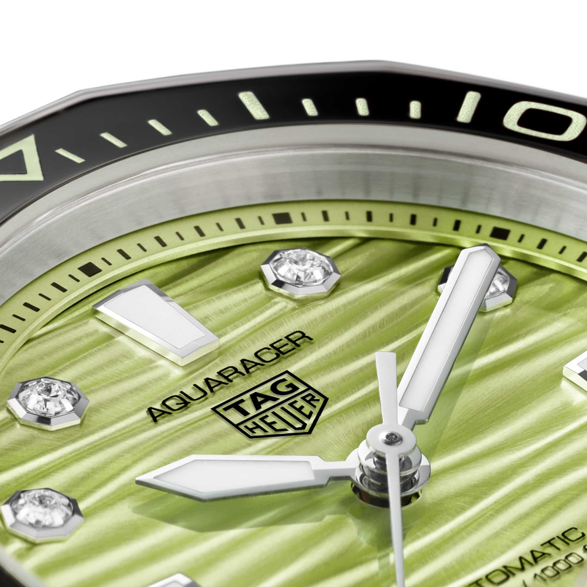 The watch’s pastel green lacquered dial, framed by a contrasting black ceramic bezel, reflects the vibrant shades of tropical waters. Eight VS+ diamond indexes and Super-LumiNova®-coated hands ensure crystal-clear legibility, day or night.