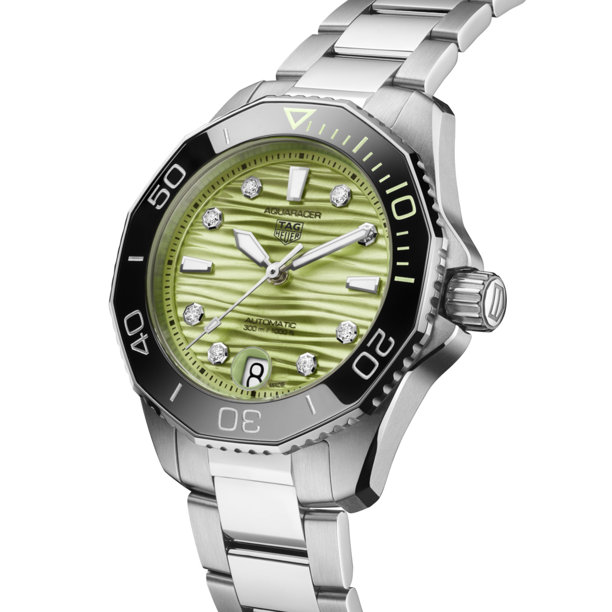 With a luminous pastel green dial and rugged build, the TAG Heuer Aquaracer Professional 300 Date is ready for deep dives and sunlit shores alike. Engineered to withstand the sea’s most powerful forces, it pairs elegance with serious diving credentials.