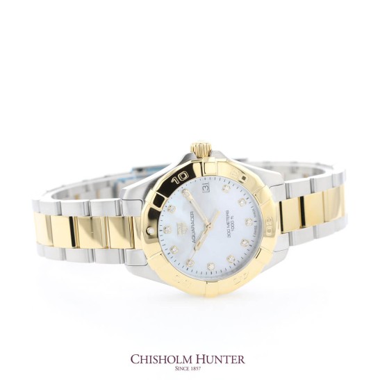 Pretty and feminine, this sporty timepiece is robust and suitable for all challenges yet boasts a glamourous feel too. A 32mm case hosts a mother of pearl dial with the TAG Heuer shield, the three polished and facetted hands all plated in yellow gold as well as the 60-minute scale unidirectional turning bezel. Eleven of the gold-plated indexes are adorned with twinkling diamonds, 0.11 ct in total. Water resistant to 300 metres, this timepiece is presented on a stainless steel bracelet that has been polished and brushed to perfection.