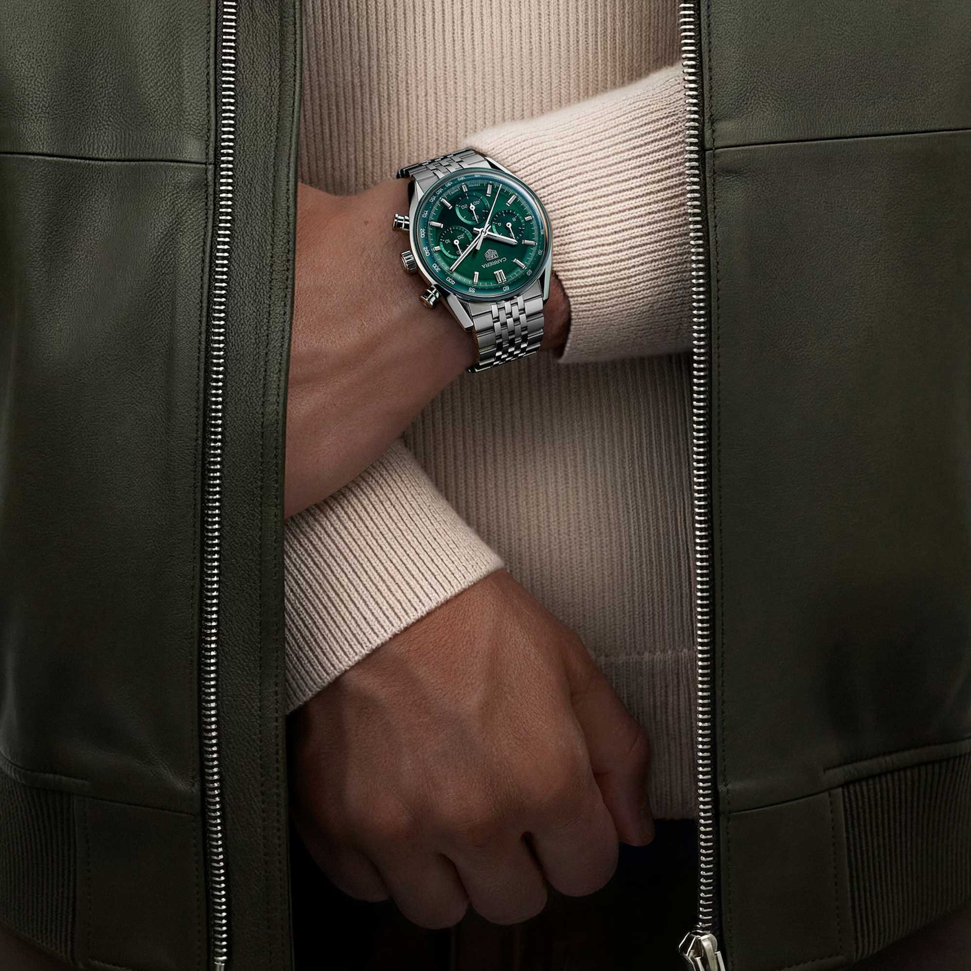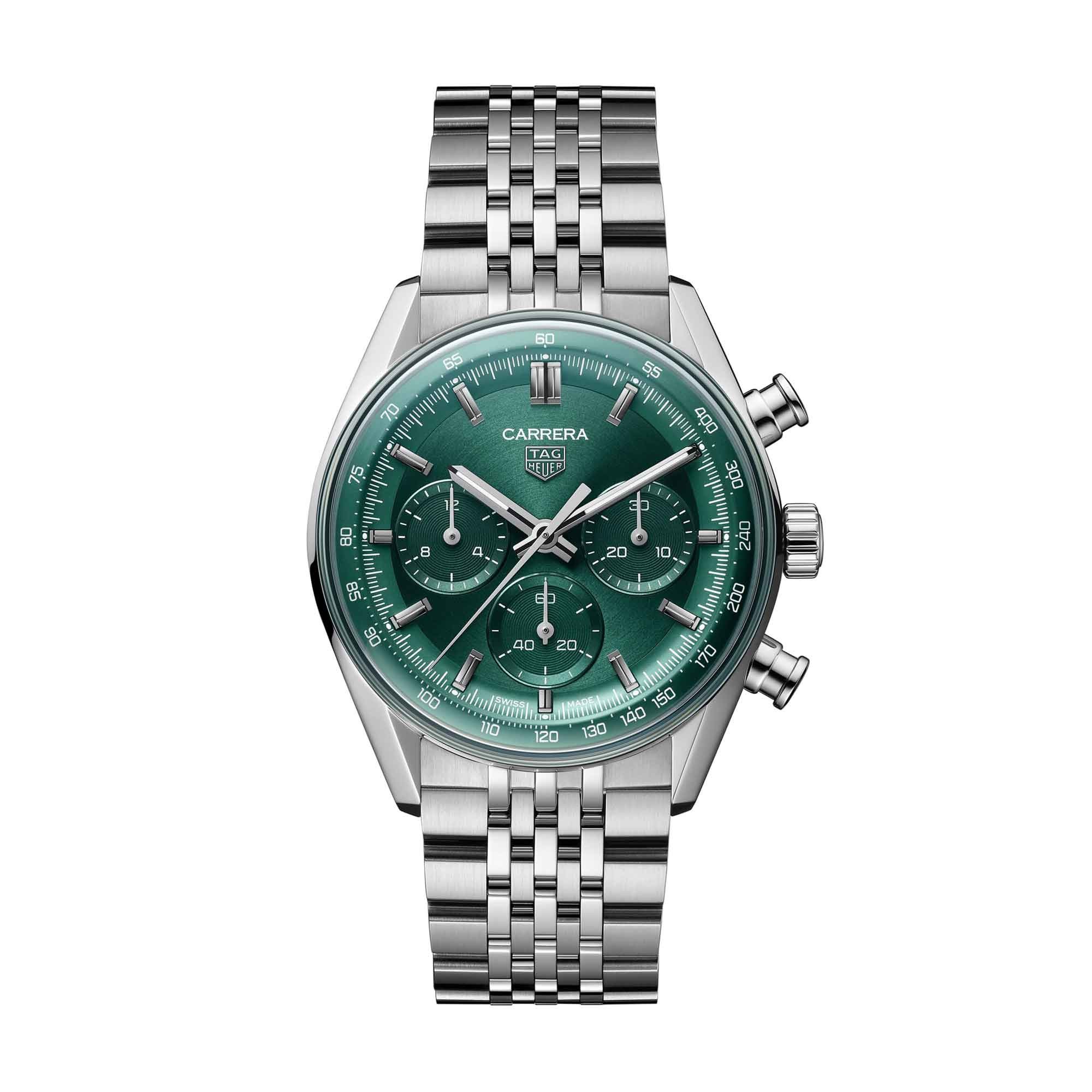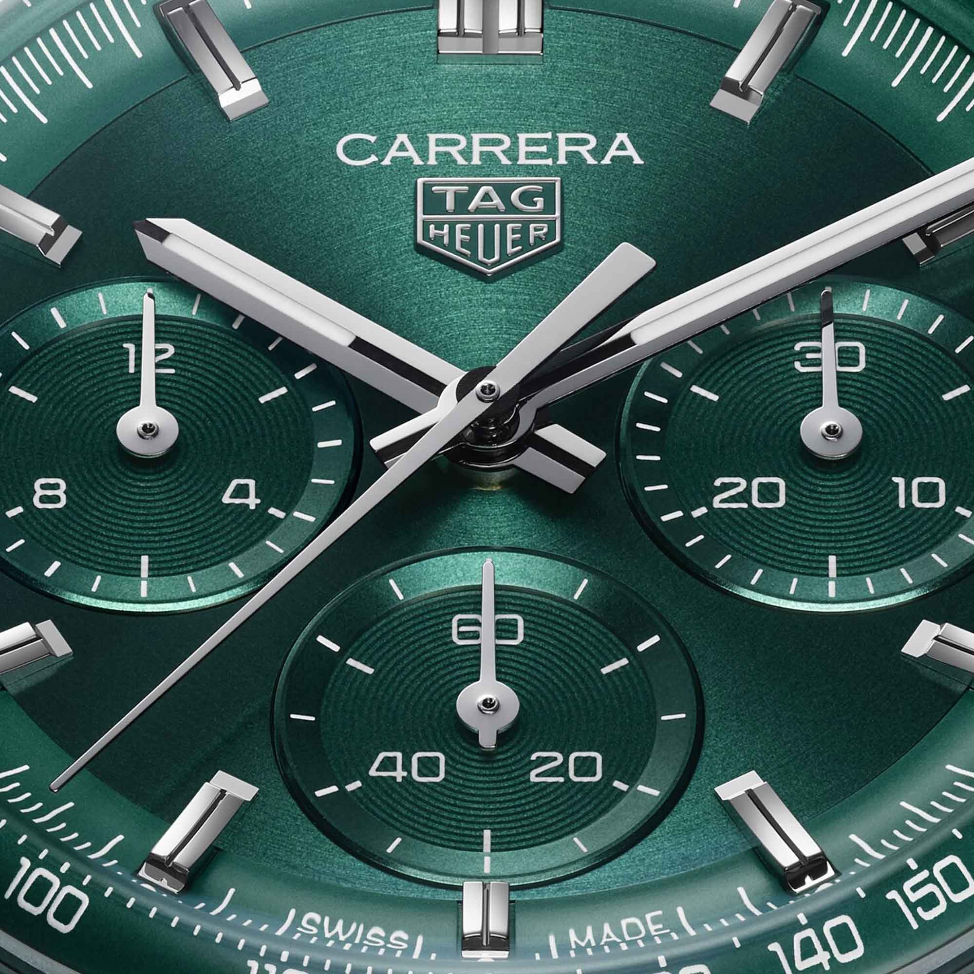 Elegant yet assertive, this 41 mm TAG Heuer Carrera Chronograph pairs refined design with high performance. The green circular-brushed dial radiates contemporary style, while the in-house automatic Calibre TH20-01 ensures precision and durability with an 80-hour power reserve.
