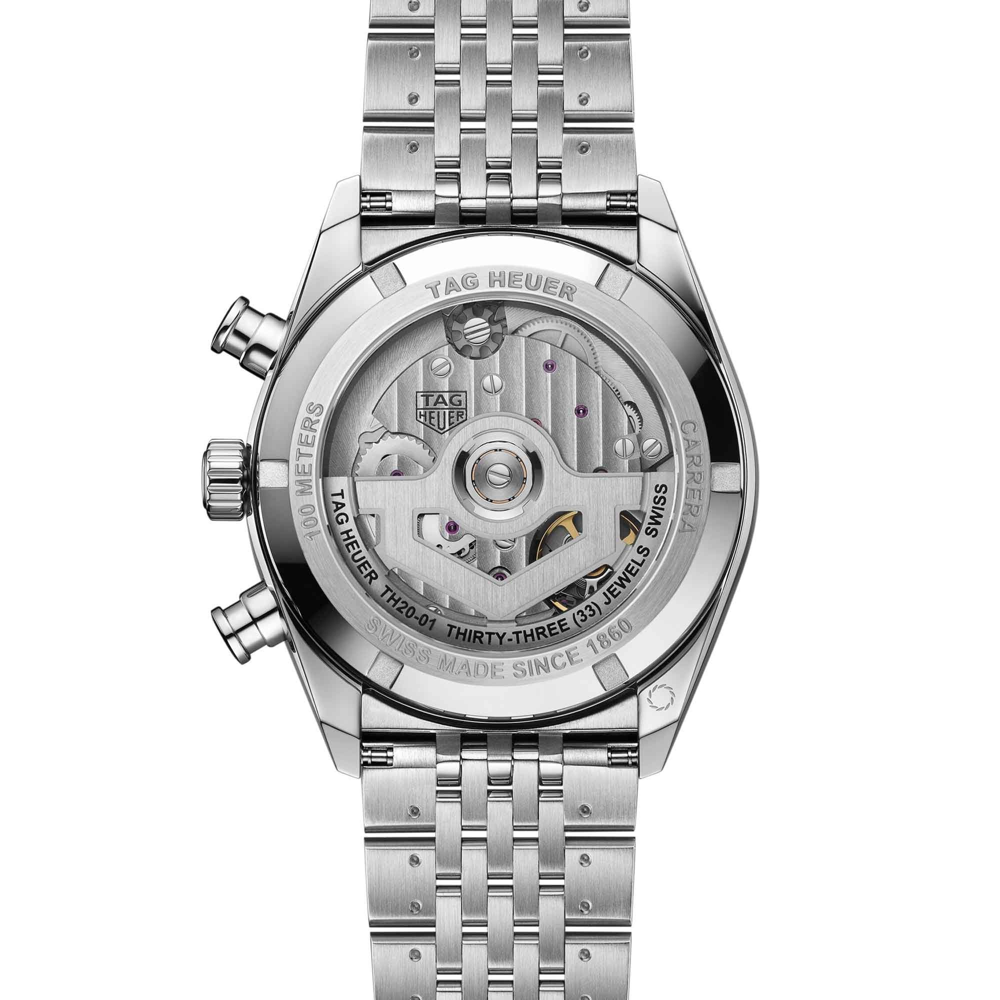The seven-row steel beads-of-rice bracelet combines flexibility and sophistication. On the rear lug, the engraved Victory Wreath symbolises success and good fortune, completing this modern expression of TAG Heuer Carrera style and performance.