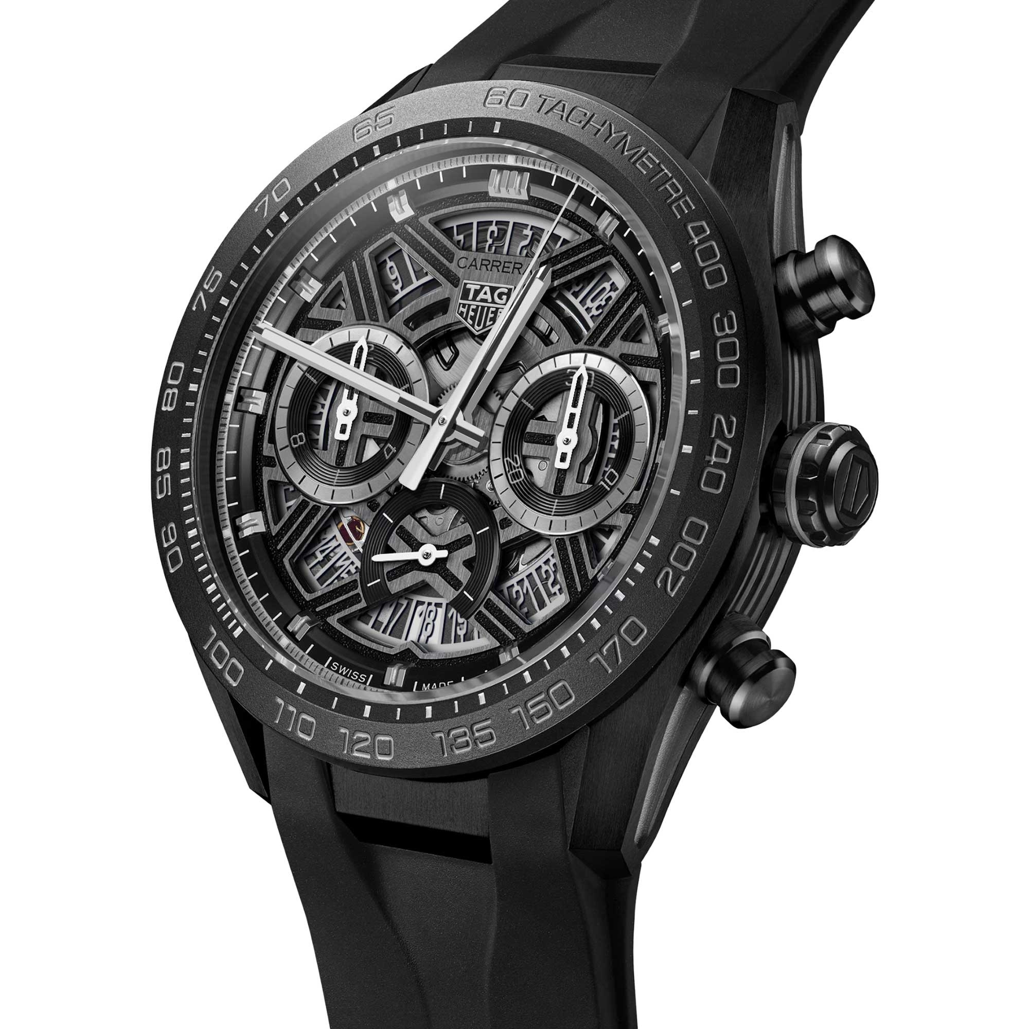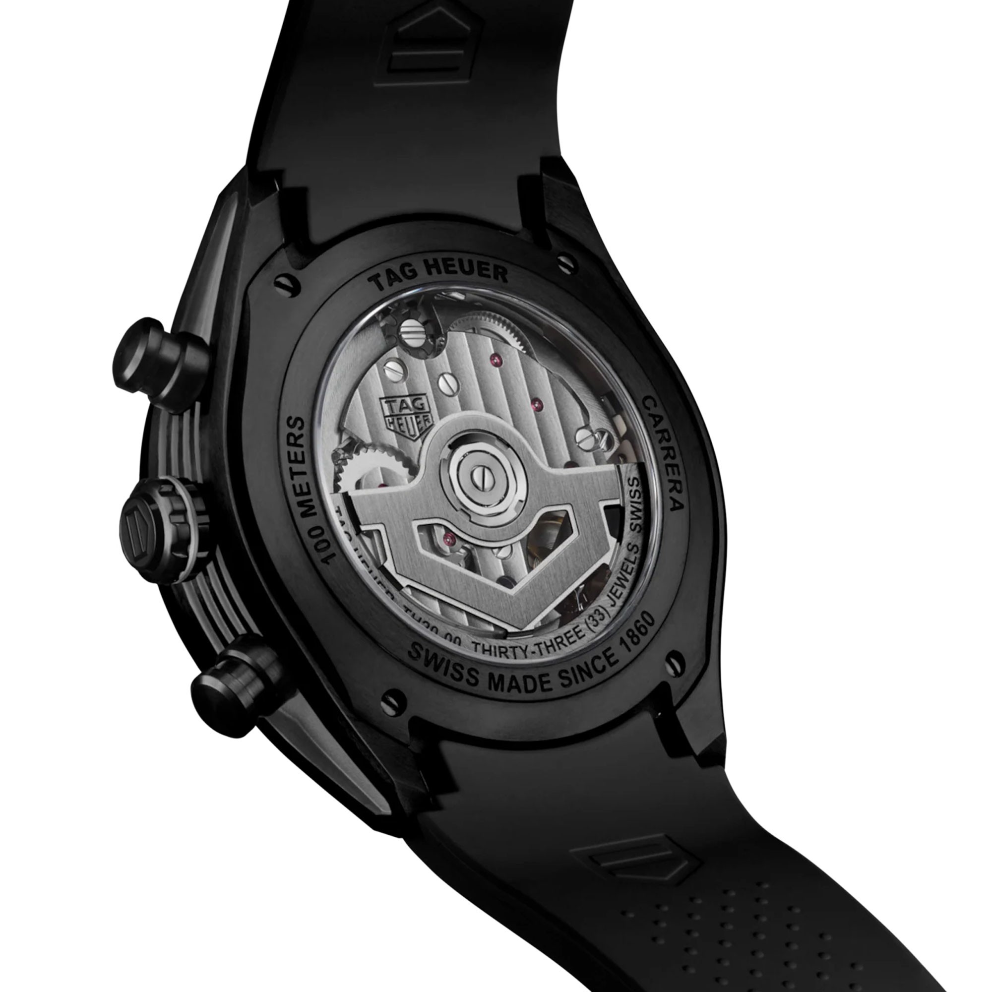 Immerse yourself in the essence of motorsport with this striking 44 mm TAG Heuer Carrera Chronograph. Dressed entirely in black, it strikes a bold statement of elegance and power, designed for those who live and breathe the thrill of the race.