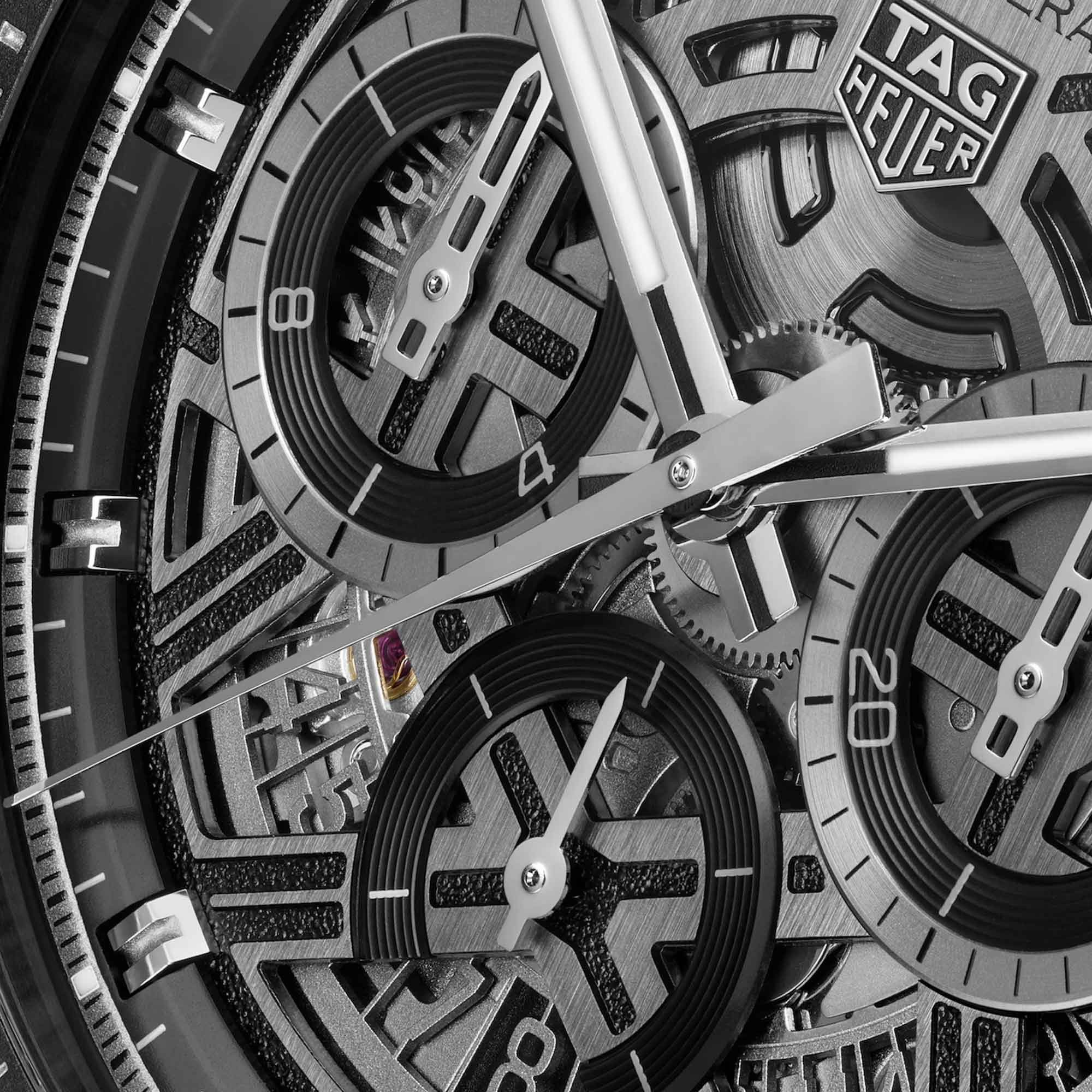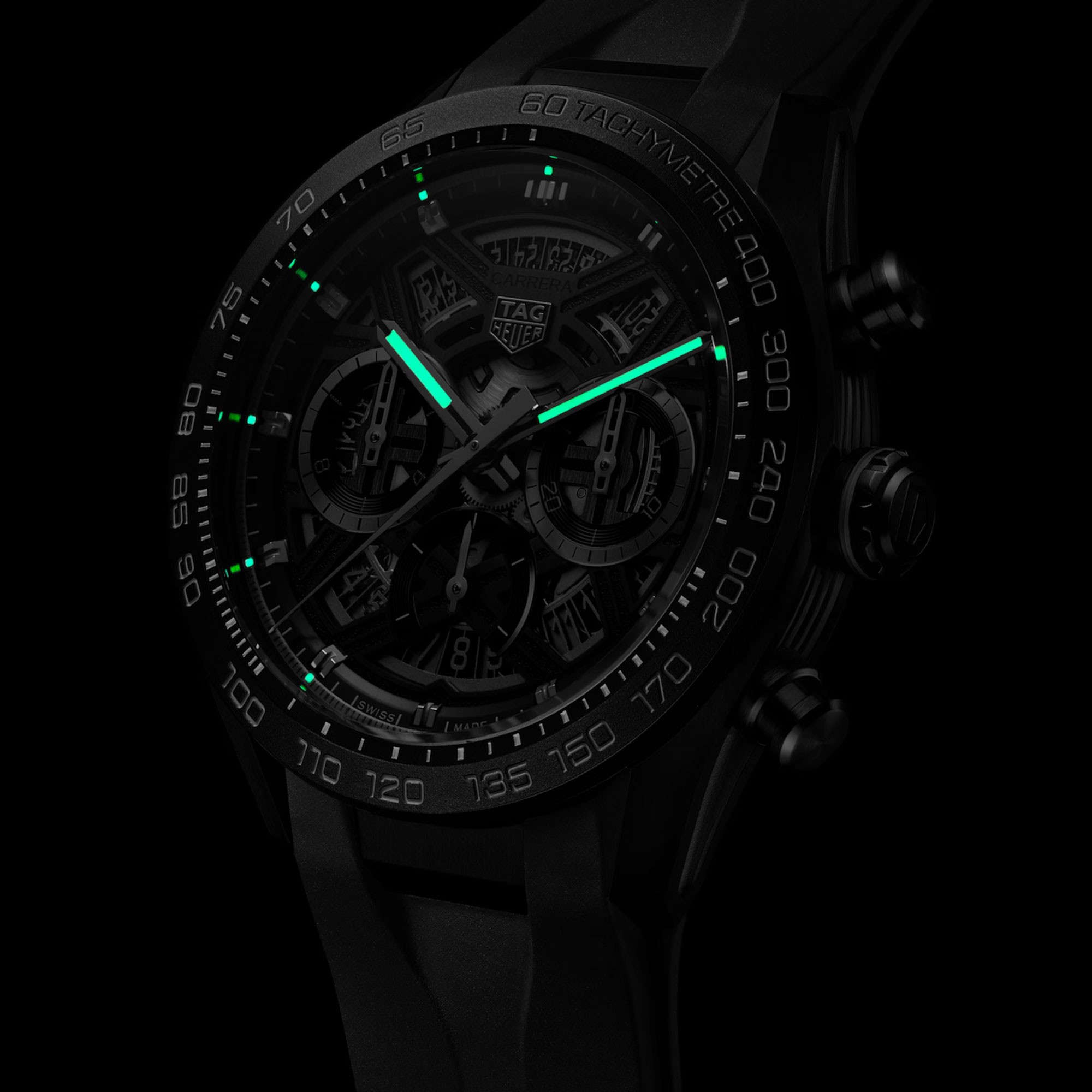 The skeletonised dial, with black finishing and a grained black details, matches the black flange and contrasts with the bright Super-LumiNova® applied hands.