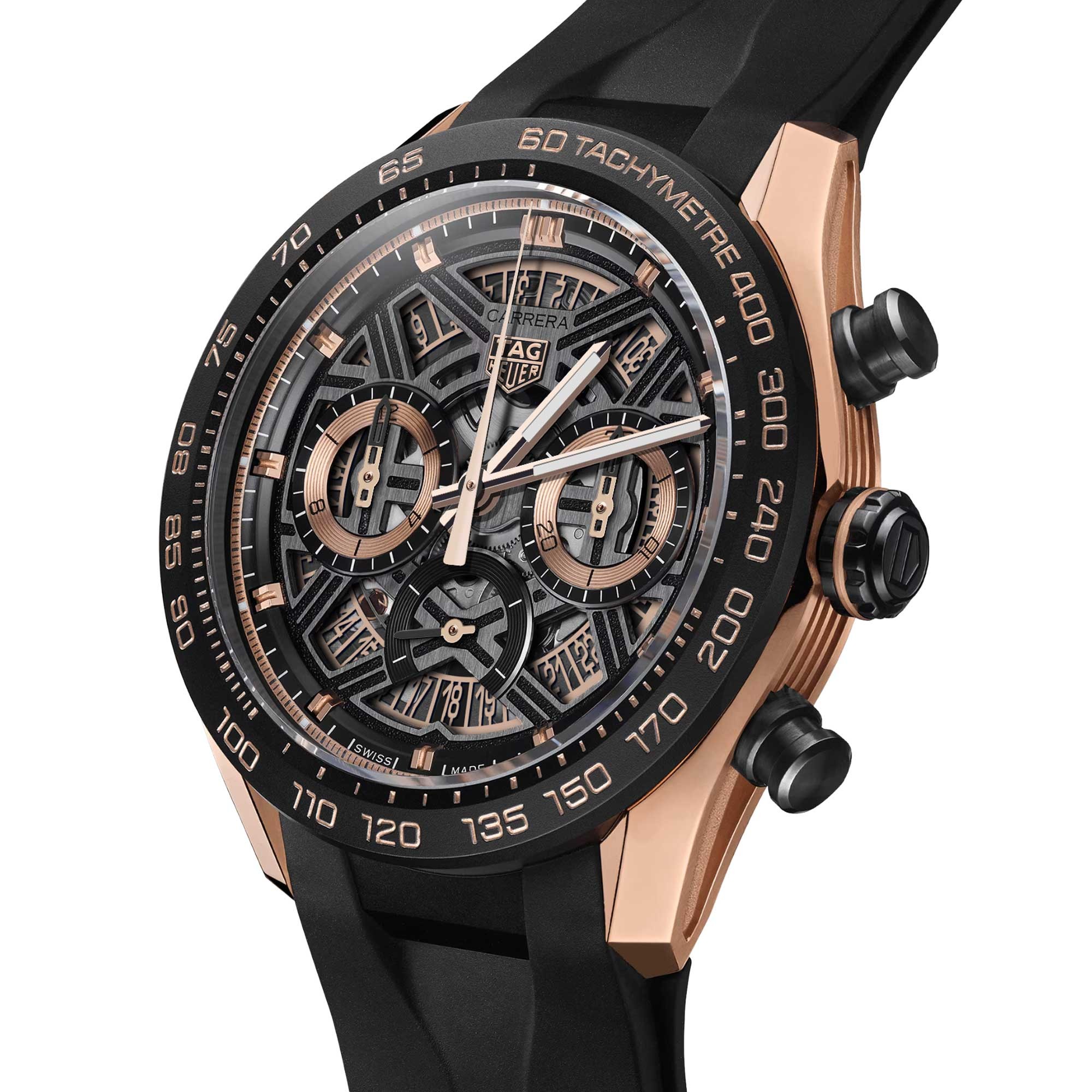 The black-finished skeleton dial, framed by 18K 5N rose gold-plated subdial rings and hands, offers a glimpse into the watch's intricate mechanics, blending performance with sophistication.