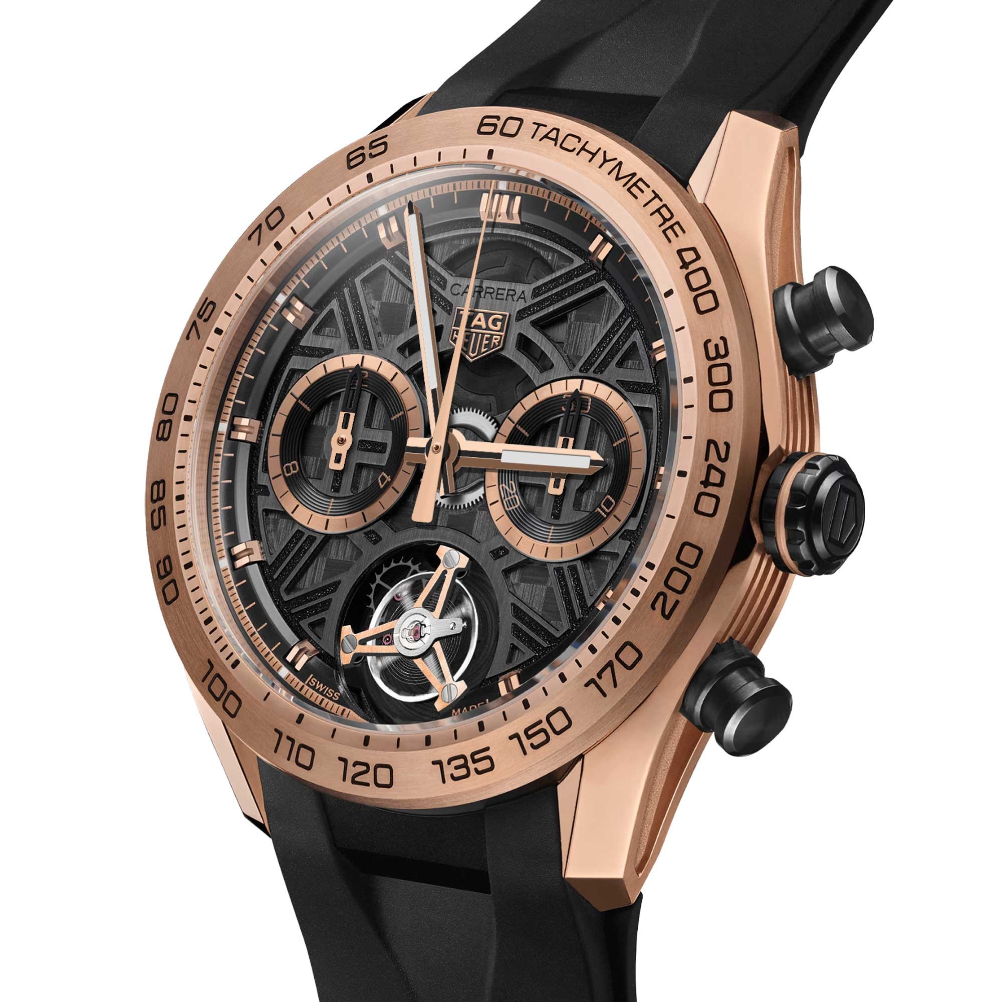Embrace the fusion of luxury and performance with the TAG Heuer Carrera Chronograph Tourbillon, a striking embodiment of motorsport passion. With its prestigious blend of 18K 5N solid rose gold and Grade 2 titanium, this timepiece redefines the essence of high-end sports watches.