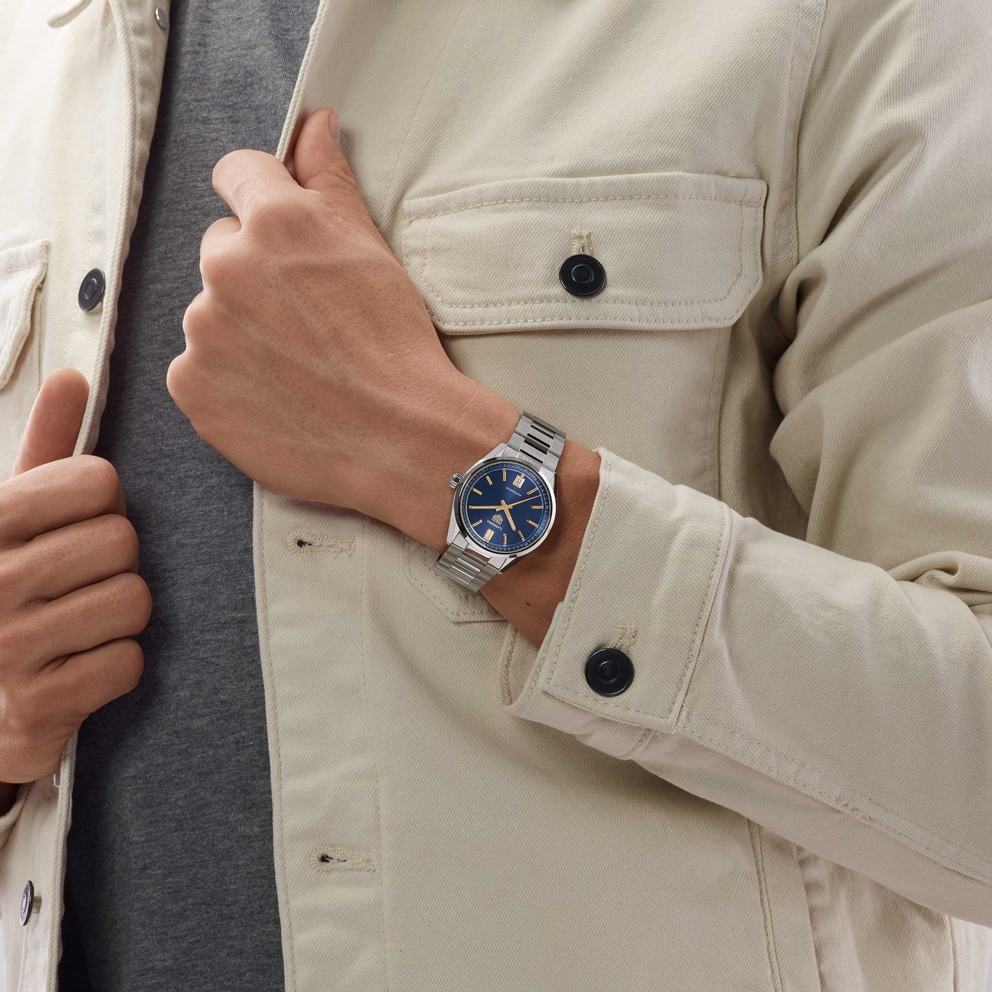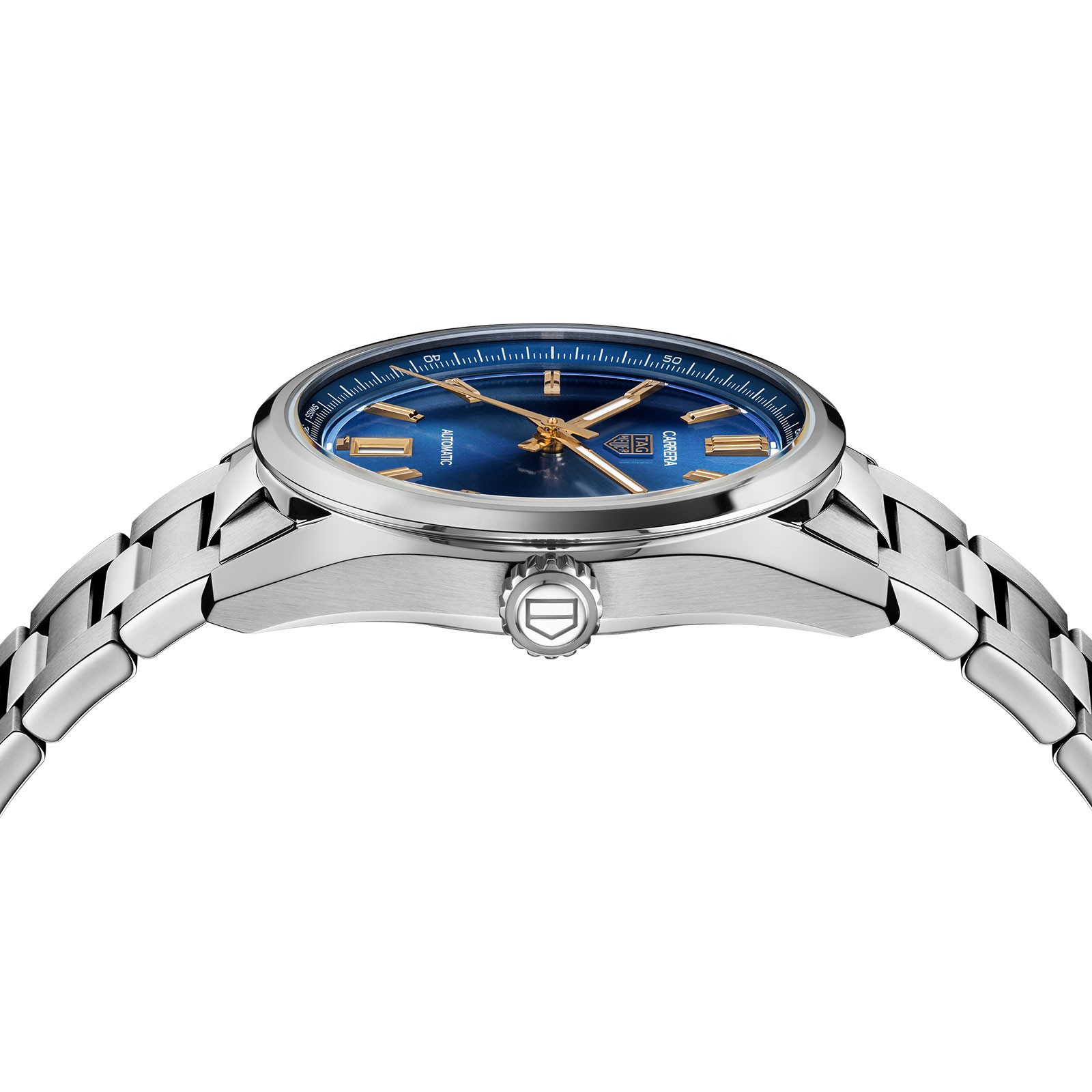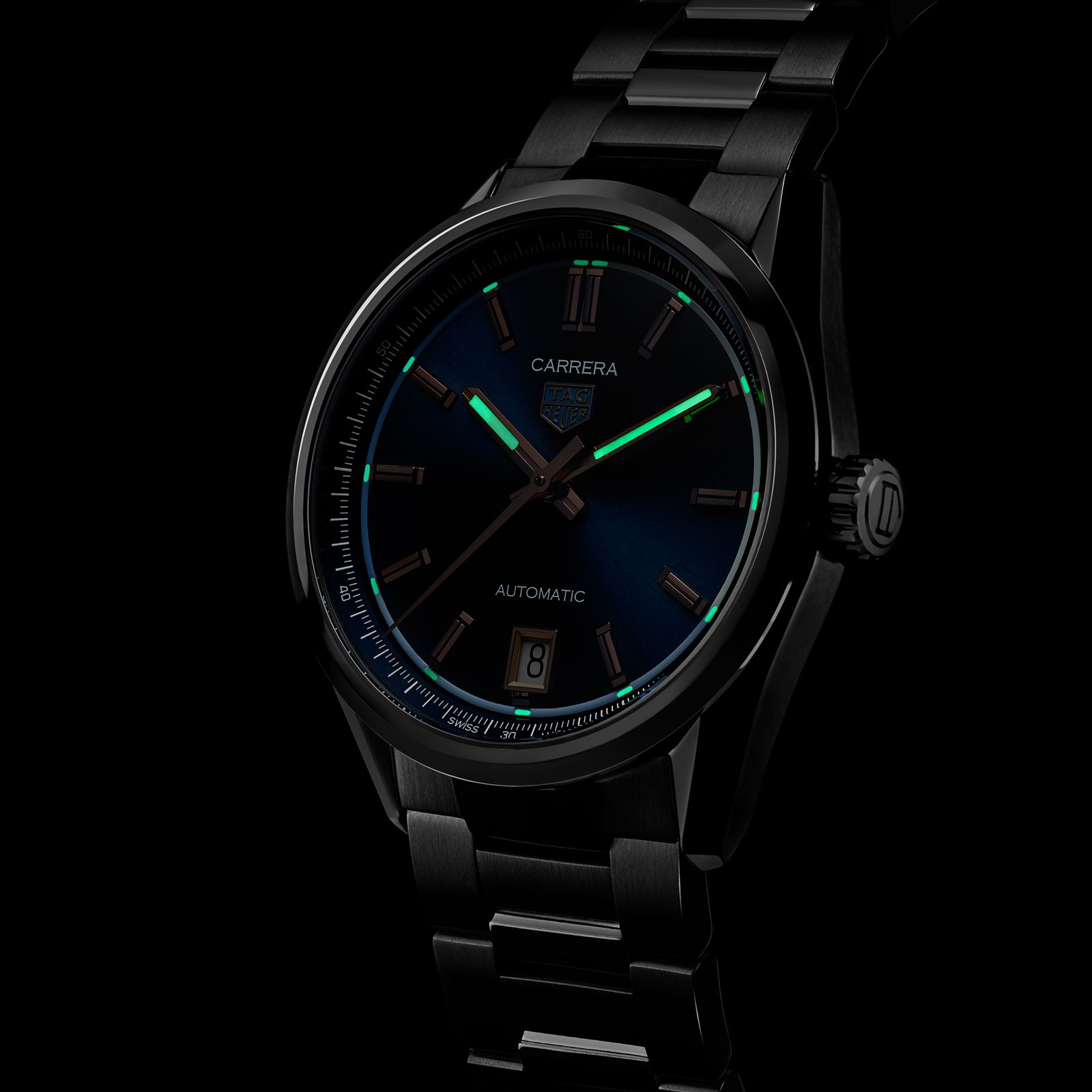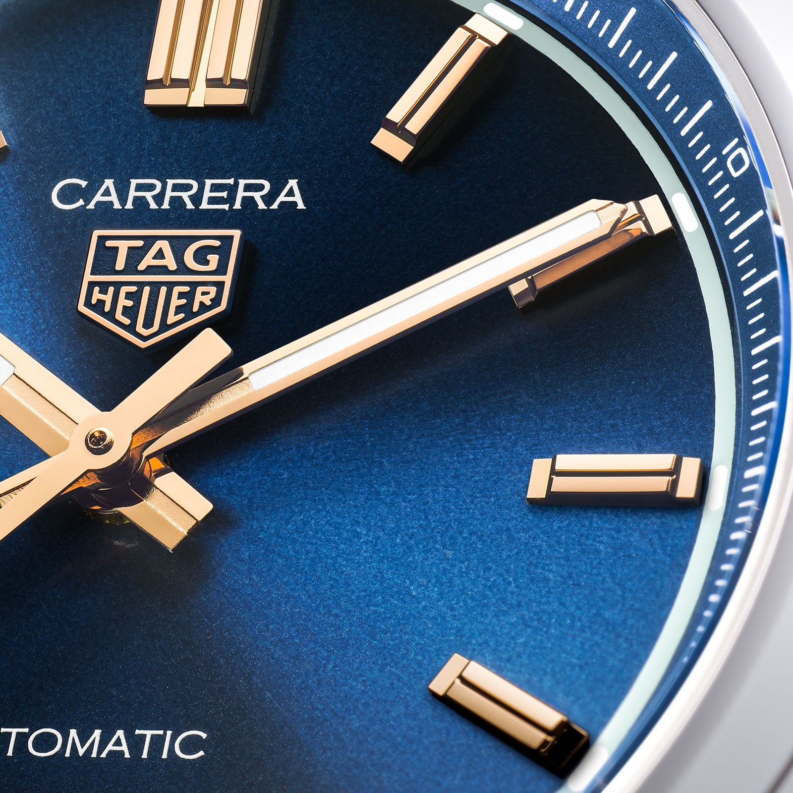 Luxurious 18K 5N rose gold-plated hands and indexes stand out superbly against the dramatic blue sunray brushed dial of this classic TAG Heuer Carrera. Water-resistant to 100 metres and integrating the TAG Heuer Calibre 7 movement with a 56-hour power reserve, this bold watch is driven to overcome.