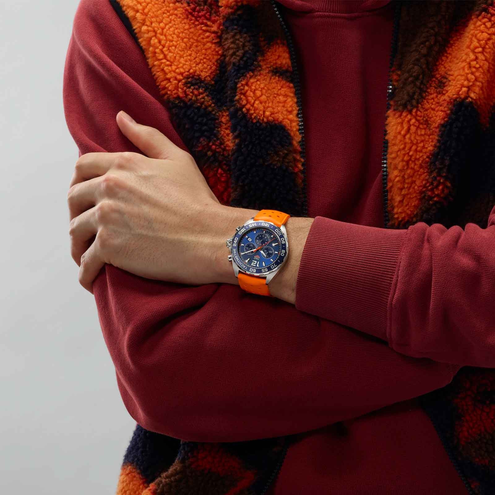 The watch’s sporty appeal is heightened by a durable synthetic strap, secured with a classic pin buckle, ensuring comfort and a perfect fit. Water-resistant up to 200 metres, this TAG Heuer marvel is designed to withstand the rigours of an active lifestyle, making it an ideal companion for both casual and formal settings.