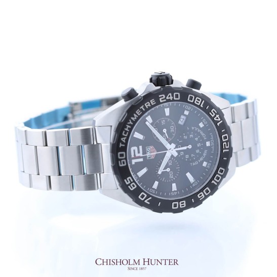 The TAG Heuer Formula 1 gents watch is the most stand-out watch in this collection, with its elegant all-black features, it is advertised for the man who is not afraid to stand out and take risks. The Swiss made automatic movement in this watch has means it inherits the 'timing technology and expertise' TAG Heuer has built up for itself over the decades of involvement within Formula 1. The stainless steel bracelet is perfectly complimented by the black titanium carbide coated steel on the bezel, the same material of which is used in Formula One. The 43mm case, slightly tonneau-shaped, is covered by a tachymeter bezel which is highly legible with white numbers contrasting onto the black coloured bezel. The dial itself has a three sub-dial chronograph, date window in the unusual position of 4 o'clock, silver-toned Super-LumiNova hour markers and indices and the iconic oversized '12'. Water resistant up to 200m.