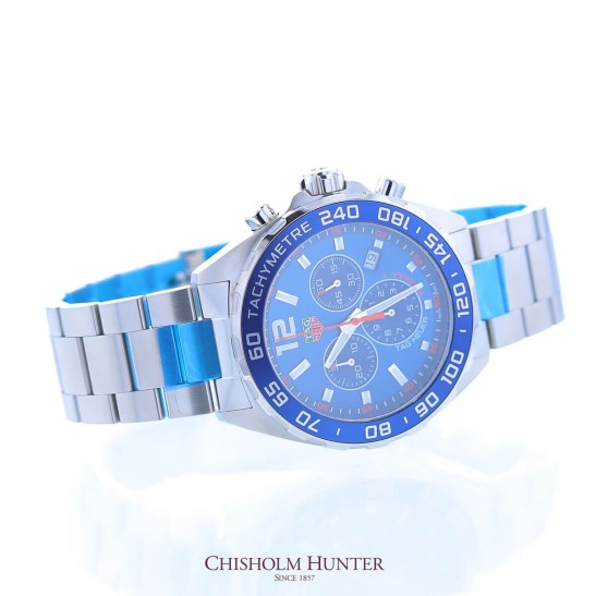The TAG Heuer Formula 1 gents quartz chronograph watch offers a versatile design with a round blue dial and tachymeter scale inspired by the 'world's most prestigious motor-sports circuit'. High-resistance materials are used in the design of this watch, including the scratch resistance sapphire crystal glass and the 43mm tonneau-shaped case in stainless steel. Super-LumiNova indices large hands and over-sized '12' all provide better readability. On the blue dial are three chronograph counters which track permanent seconds, hours, minutes and 1/10ths of a second. The watch itself gives a sophisticated look, delivers 100% function and has a sporting allure throughout every moment of the day. Water resistant to 200m.