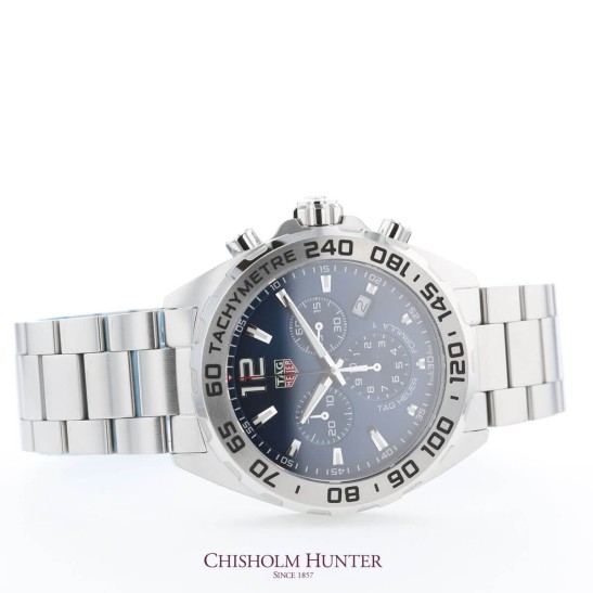 The TAG Heuer Formula 1 gents watch is powered by a Swiss made quartz movement and made onto a very masculine 3-row steel bracelet. The 43mm steel case has a tachymeter on a fixed bezel with black numerals. The classic blue dial has an angled date window at 4 o'clock, 3 darker coloured blue sub-dials and the iconic oversized '12'. Quartz powered to maintain ultimate precision like their Formula One partners, and water resistant up to 200, this watch with all of its fantastic features is ready for anything.