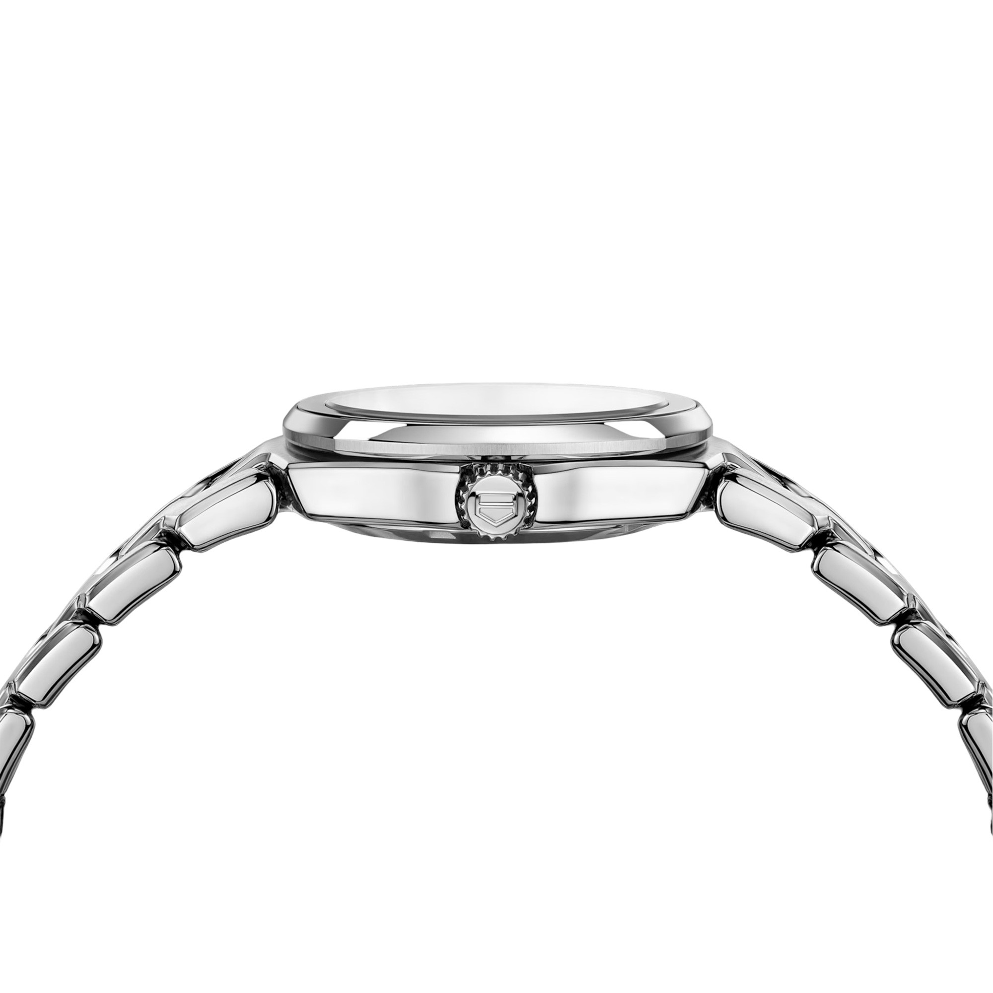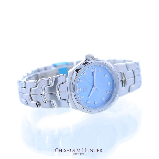 The TAG Heuer Link Lady Quartz watch is designed with a beautiful round stainless steel dial, measuring 32mm, with 12 glittering round white diamond hour markers on its luminous blue mother-of-pearl dial. The watch has a highly polished stainless steel bezel and bracelet and is made with a Swiss made quartz movement. The final detail making this such an intricate watch by design is the rhodium-plating on the hands and a silver polished TAG Heuer shield to add to its already luxurious feel. Water resistant to 100m.