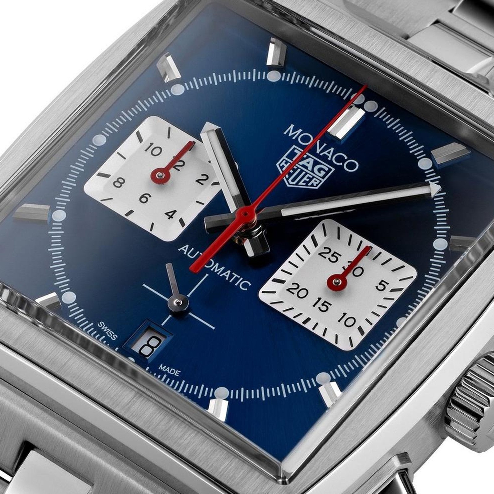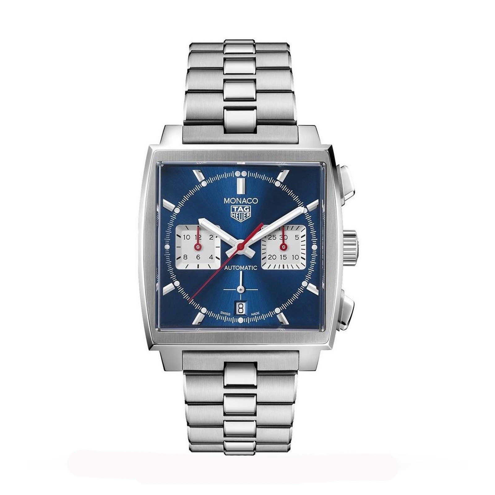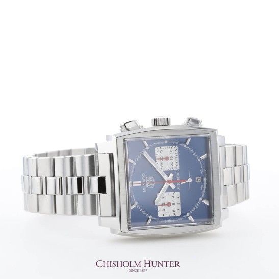 In 1969, TAG Heuer first launched the Monaco range and achieved two firsts for the brand - a water resistant timepiece with a sqaure case and the first automatic chronograph. The following year, Steve McQueen loved this design so much, he wose it in his ""Le Mans"" film, making it a true icon. This particular model features an eyegant blue sun-ray dial in a 39mm sqaure case, with a red seconds indicator, both nods to the traditional colours from the original Monaco colelction. Powered by the the in-house, state-of-the-art manufactured movement Calibre Heuer 02 automatic, this is visible through the sapphire case back. Presented on a stainless steel bracelet, this is a stylish and modern timepiece for the modern gent.