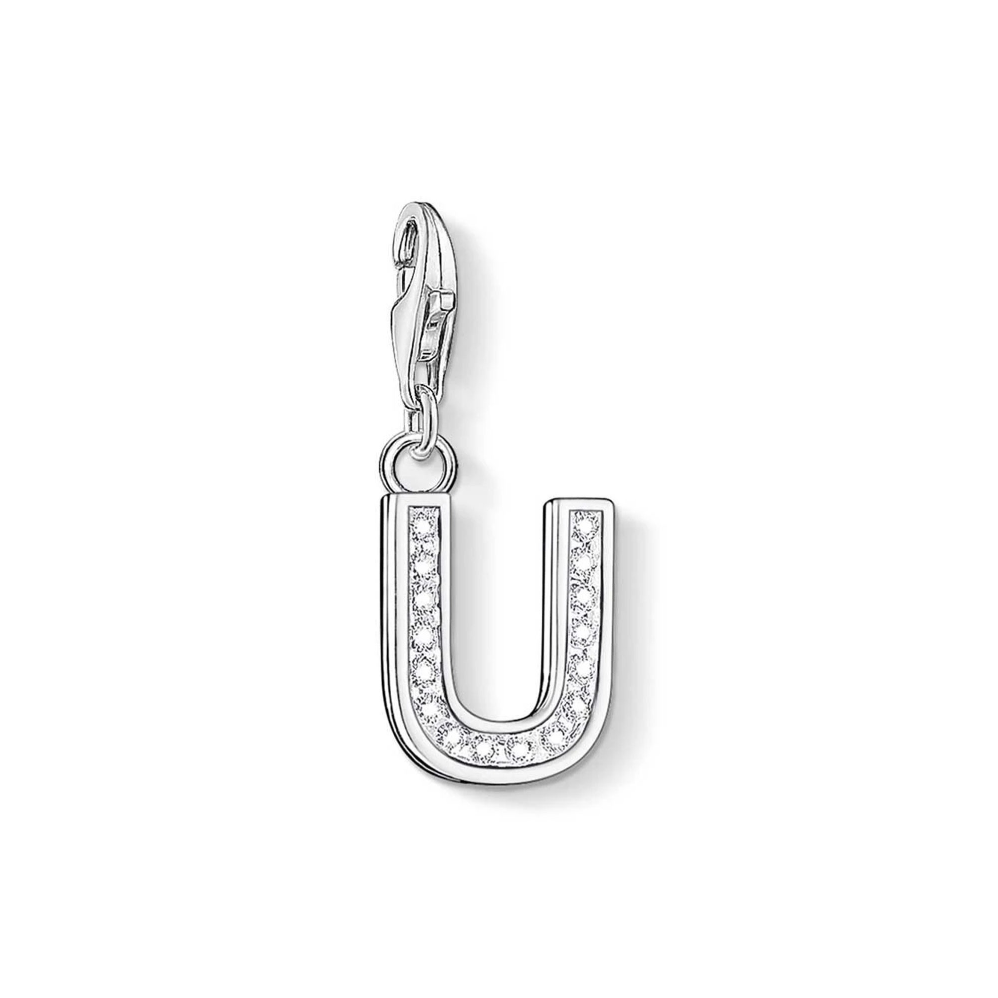 From the Thomas Sabo Charm Club collection, the 'U' initial charm is set with white cubic zirconia mounted in sterling silver, suspended from a secure lobster clasp attaching mechanism.
