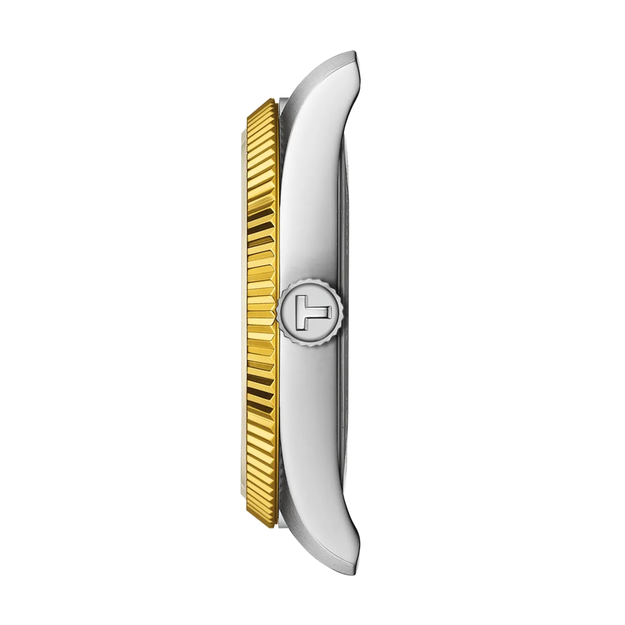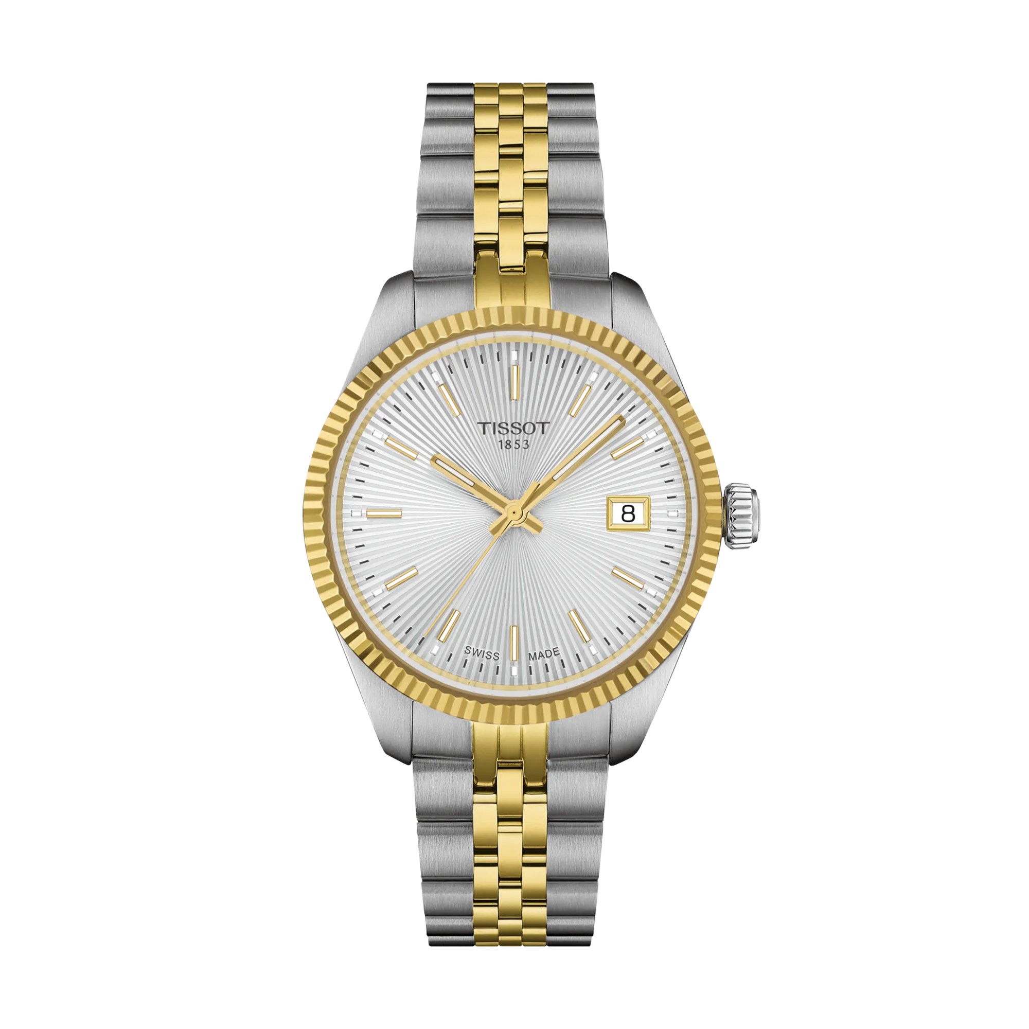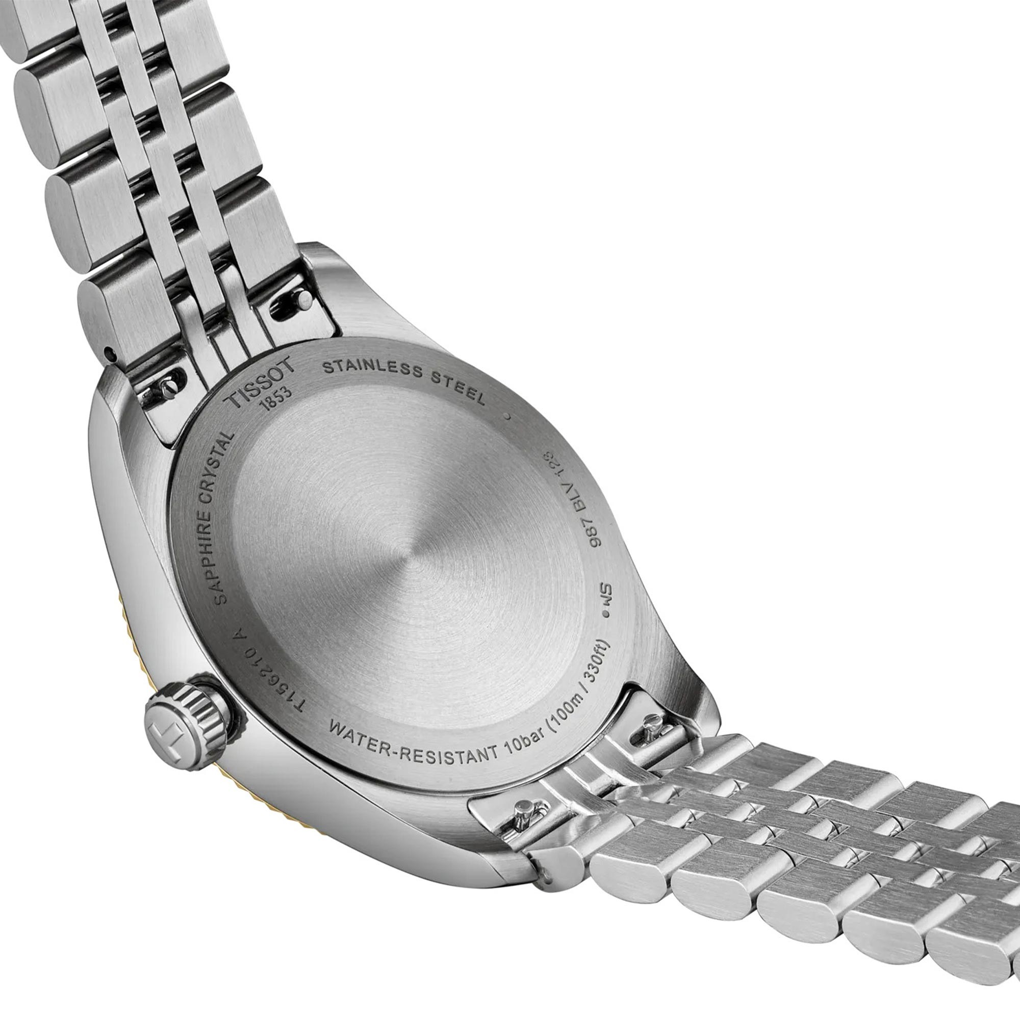Designed for women, the Tissot Ballade is water resistant up to 100 metres, making it suitable for everyday wear, including swimming. The metal bracelet, secured with a butterfly clasp, complements the case design and provides a secure fit.