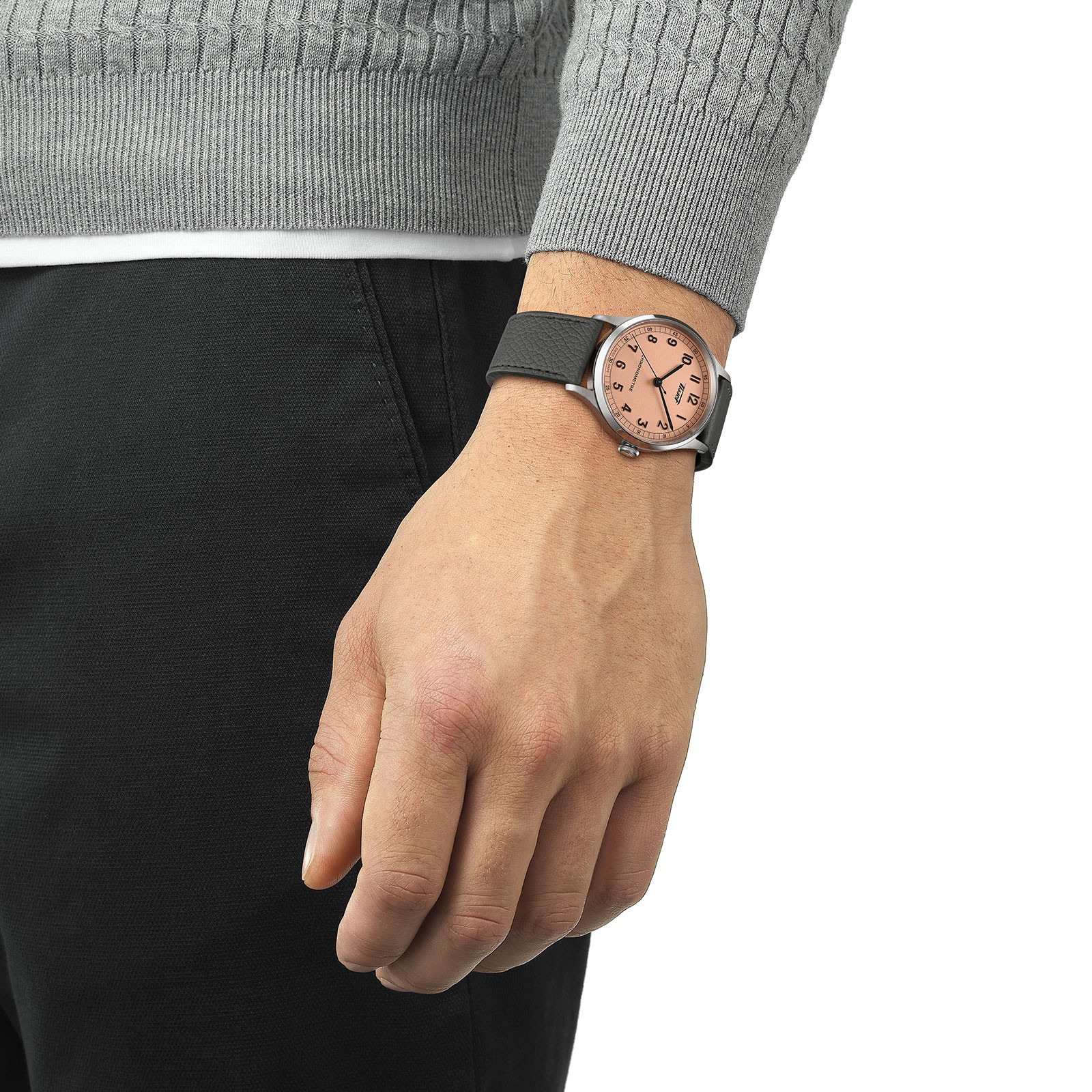 Creating elegant and timeless watches since 1853, Tissot has remained at the forefront of the evolution of fashion. Adorning the wrists of celebrities and royalty, throughout recent history Tissot watches have been a symbol of luxury and style. Combining nostalgic inspiration and contemporary shapes, the Tissot Heritage collection is just as at home in the modern era as it would be in years gone by. Introducing the Tissot Heritage 1938 39mm Men's Watch T1424641633200, featuring a 39mm stainless steel case with a pink dial accompanied with black hands and hour markers, and a date window display at 3 o'clock. A gently-curved dial mirrors the domed scratch-resistant sapphire crystal glass with anti-reflective coating. Presented on a grey leather strap and securely fastened by a folding clasp. This timepiece is powered by an automatic movement and water resistant up to 50 metres, making it the perfect addition to your collection.