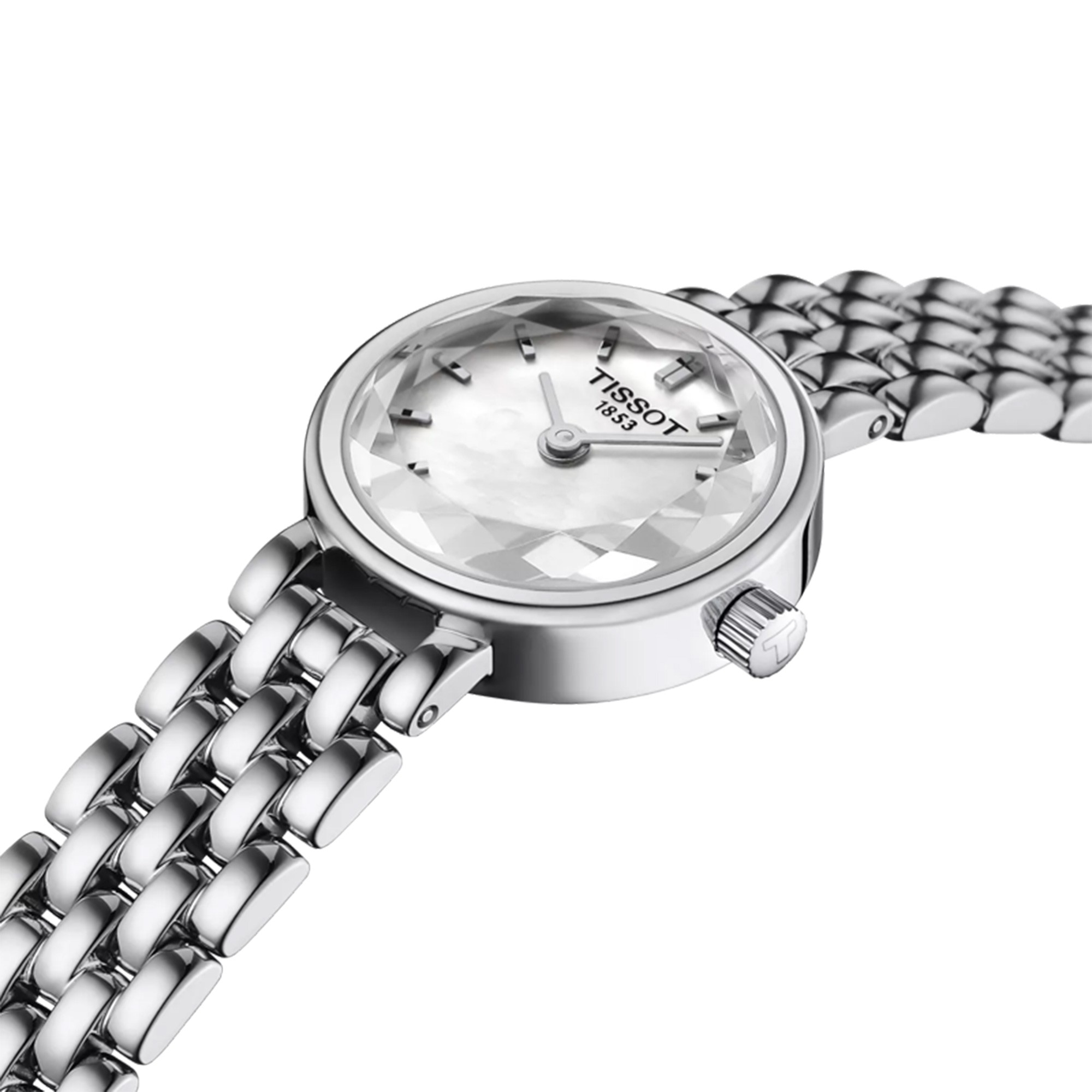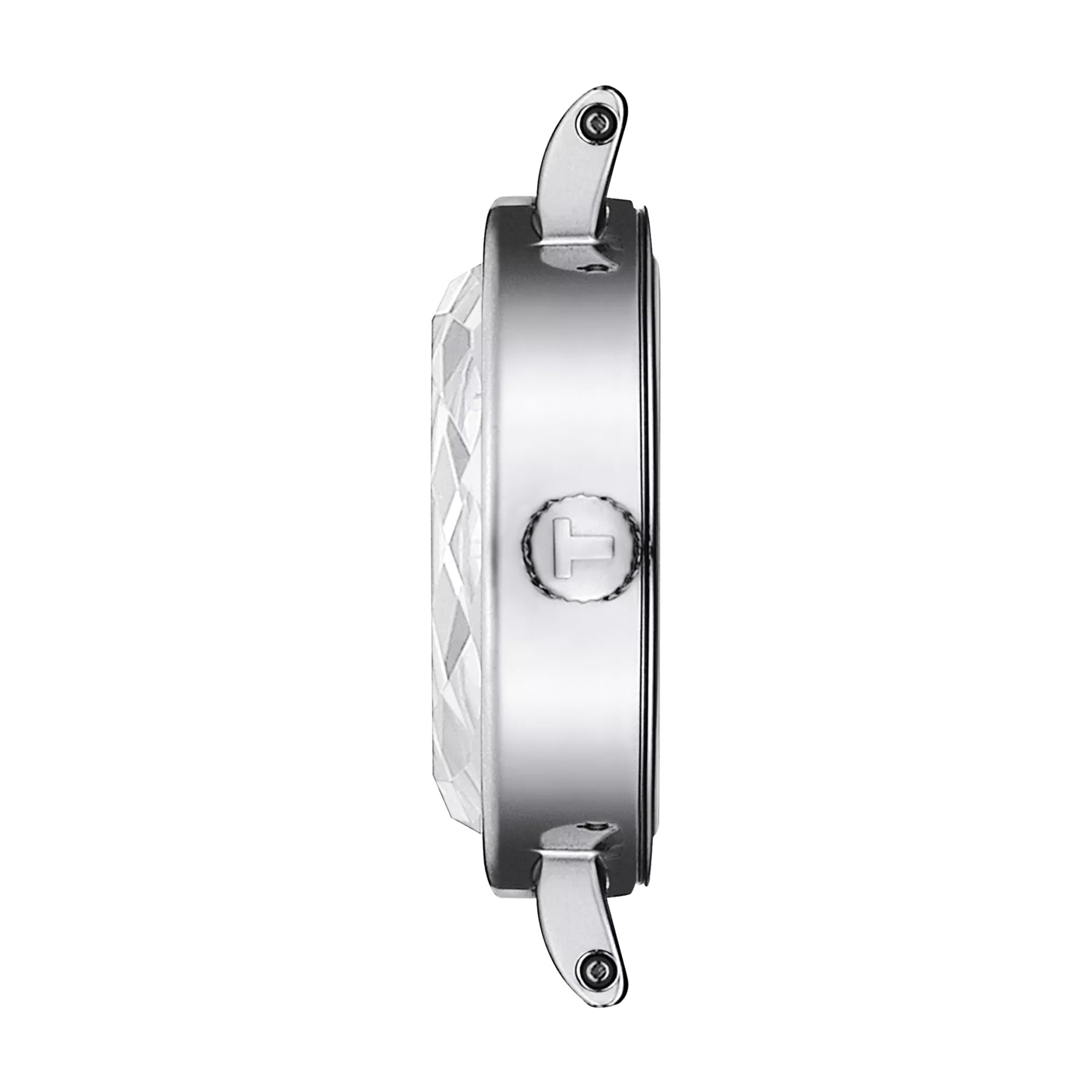 This Tissot lovely conveys the very essence of class, discrete yet gorgeous and petite with a feminine round case. The stainless steel timepiece features a Mother of Pearl index dial, sapphire crystal glass, 19.5mm width, and a quartz movement.