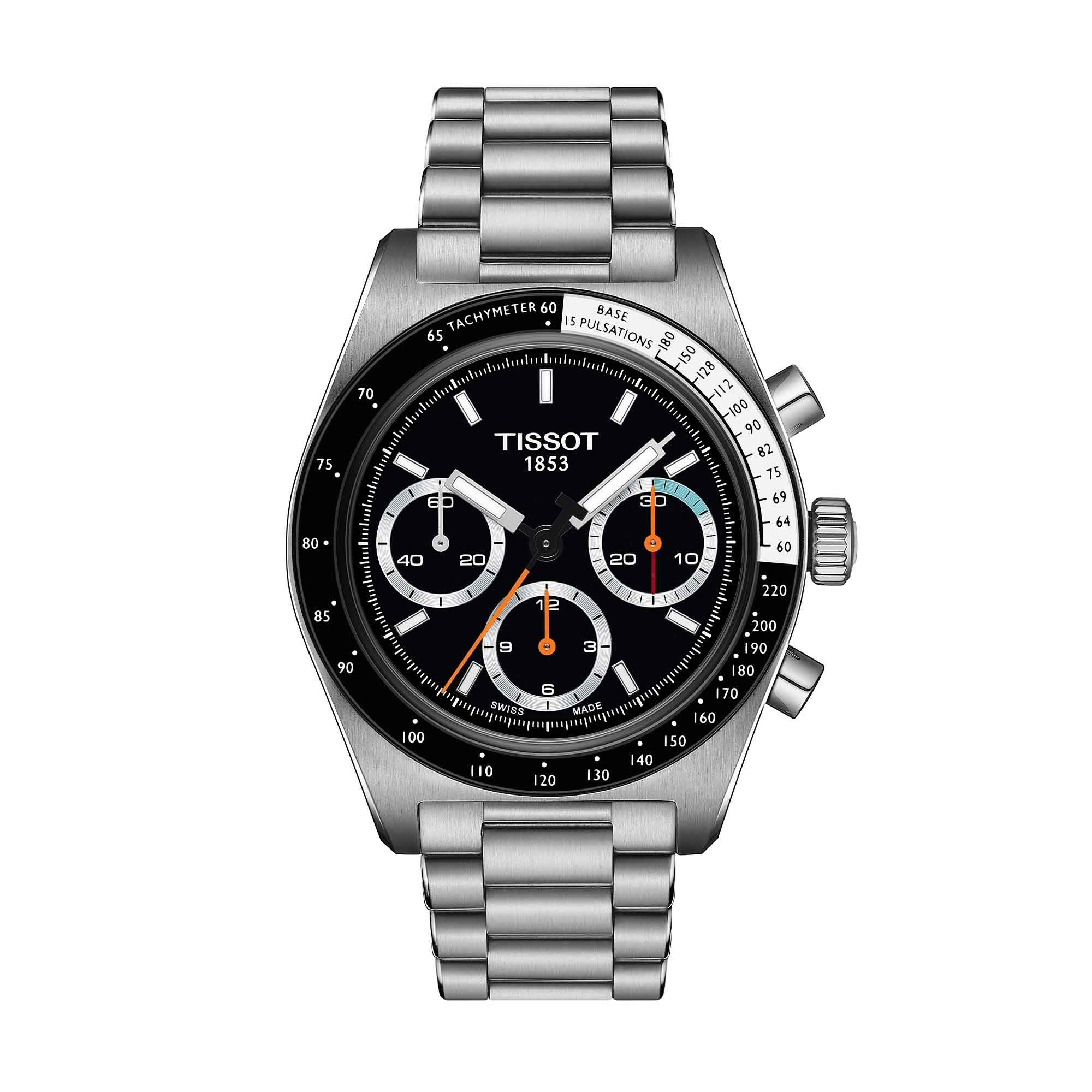 Tissot PR516 Chronograph Mechanical: a nod to Tissot's distinguished 1970 model. Crafted with a 41mm stainless-steel case and a glassbox-style sapphire crystal, this watch is an ode to sophisticated craftsmanship, powered by a Swiss manual winding movement visible through the open caseback, showcasing its intricate mechanics. The dial, featuring Super-LumiNova®️-coated indices and hands, ensures readability in any situation. A tachymeter on the bezel adds a touch of functionality. Its versatile design is complemented by a domed stainless-steel bracelet with a quick interchangeable system, perfect for transitioning from business meetings to casual outings. The PR516 Chronograph Mechanical is an exquisite piece for watch connoisseurs who appreciate timeless design and mechanical precision. Discover this 41mm mechanical chronograph with its black dial, matching counters, contrasting hands and stainless steel bracelet, for a sporty and elegant look.