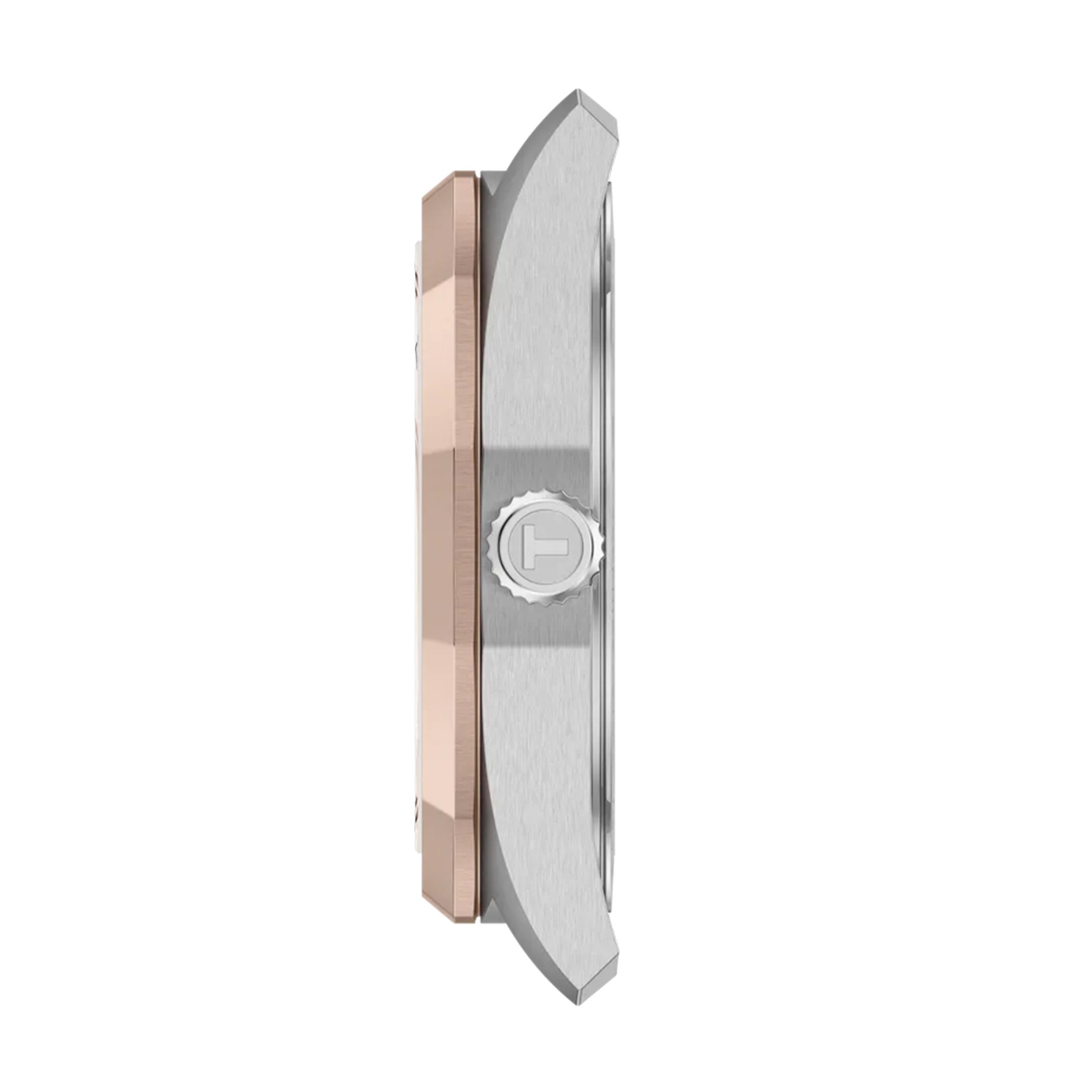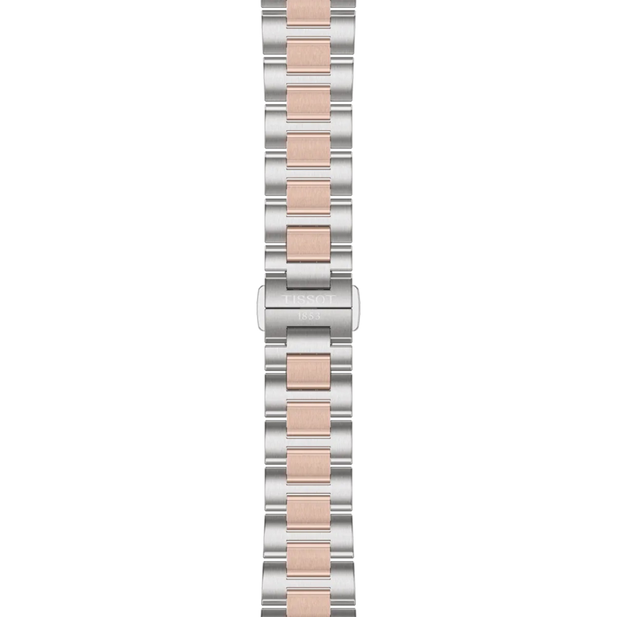 Protected by sapphire crystal glass, the watch is scratch-resistant, preserving its beauty through daily wear. The 100-metre water resistance lets you wear it confidently during various activities. The watch's round case, measuring 9.14mm in depth, is crafted from stainless steel with a rose gold PVD coating, adding a touch of luxury. The silver and rose gold colour scheme complements the stylish metal bracelet, fitted with a butterfly clasp for comfortable wear.