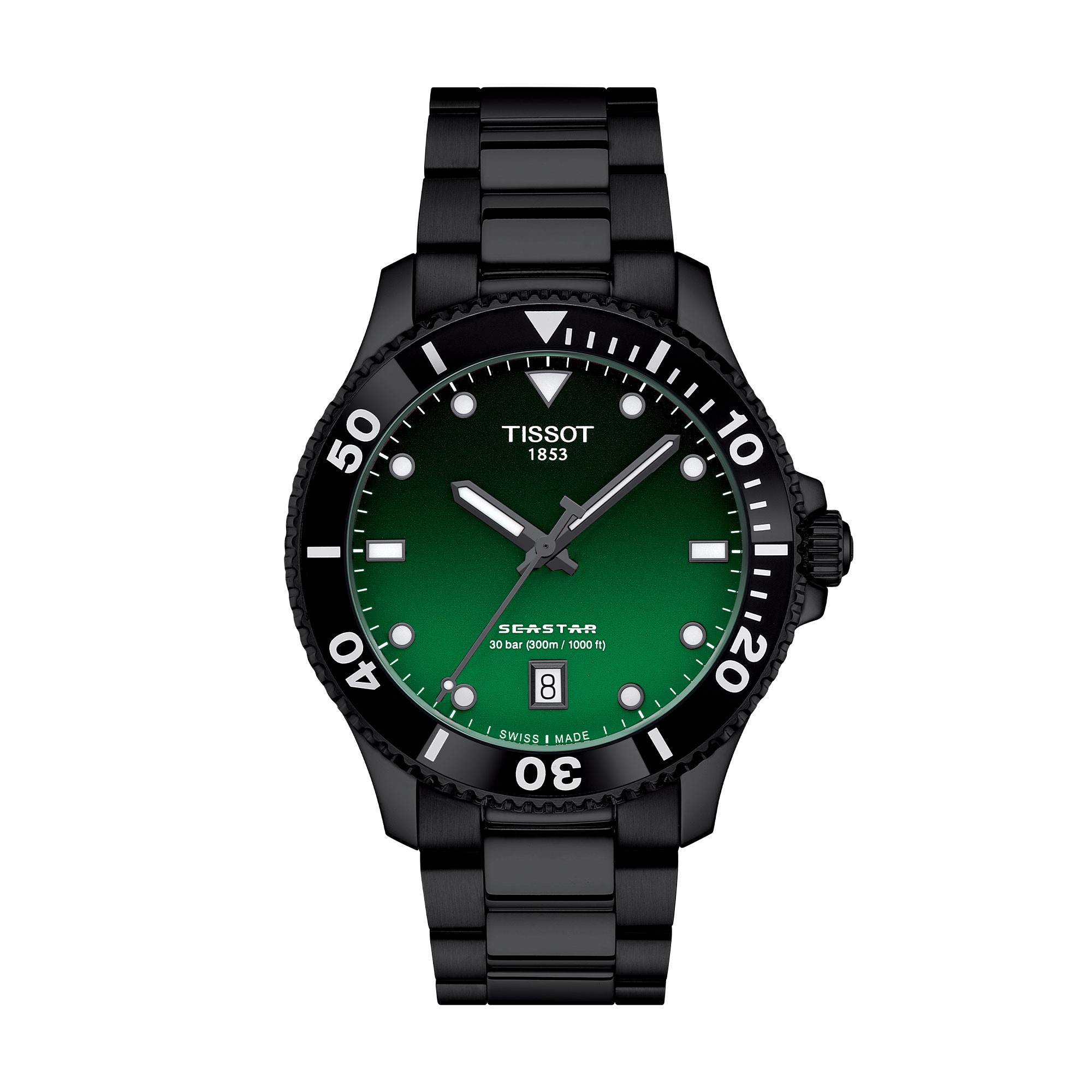 Introducing the Tissot Seastar 1000 Quartz 40mm Men's Watch (T1204103309100), a perfect combination of functionality and style. This watch features a quartz movement for precise timekeeping, ensuring you stay punctual. Its striking green dial is complemented by dot and baton markers, providing a clear and readable display.